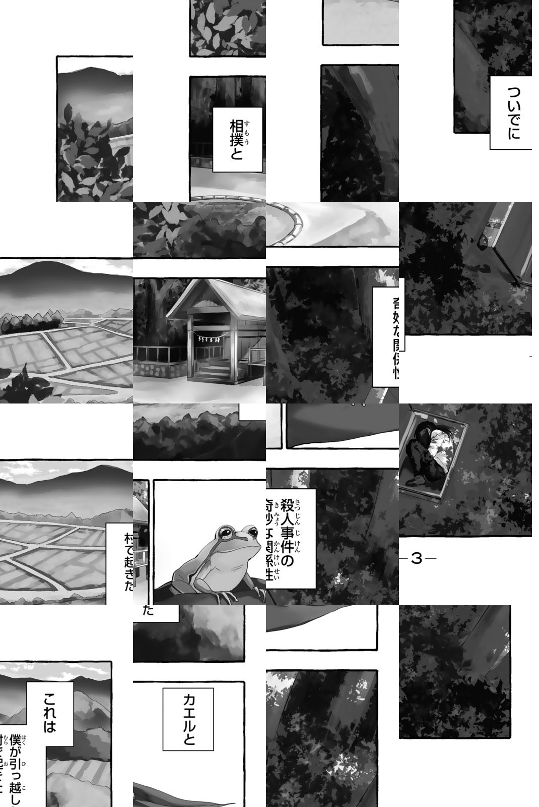 両親を突然の事故で亡くした高校生・逢沢文季。親戚に引き取られ暮らすことになった村で彼が体験したのは、二本足で立ち、相撲を取るカエル達との遭遇、林に捨てられたトランク詰めの死体の謎解き、そして、オートバイを片手で軽く持ち上げる不思議な少女・遠泉真夏との日々だった――『虚構推理』城平京がおくる[青春×神事×ミステリ]、はじまりはじまり。