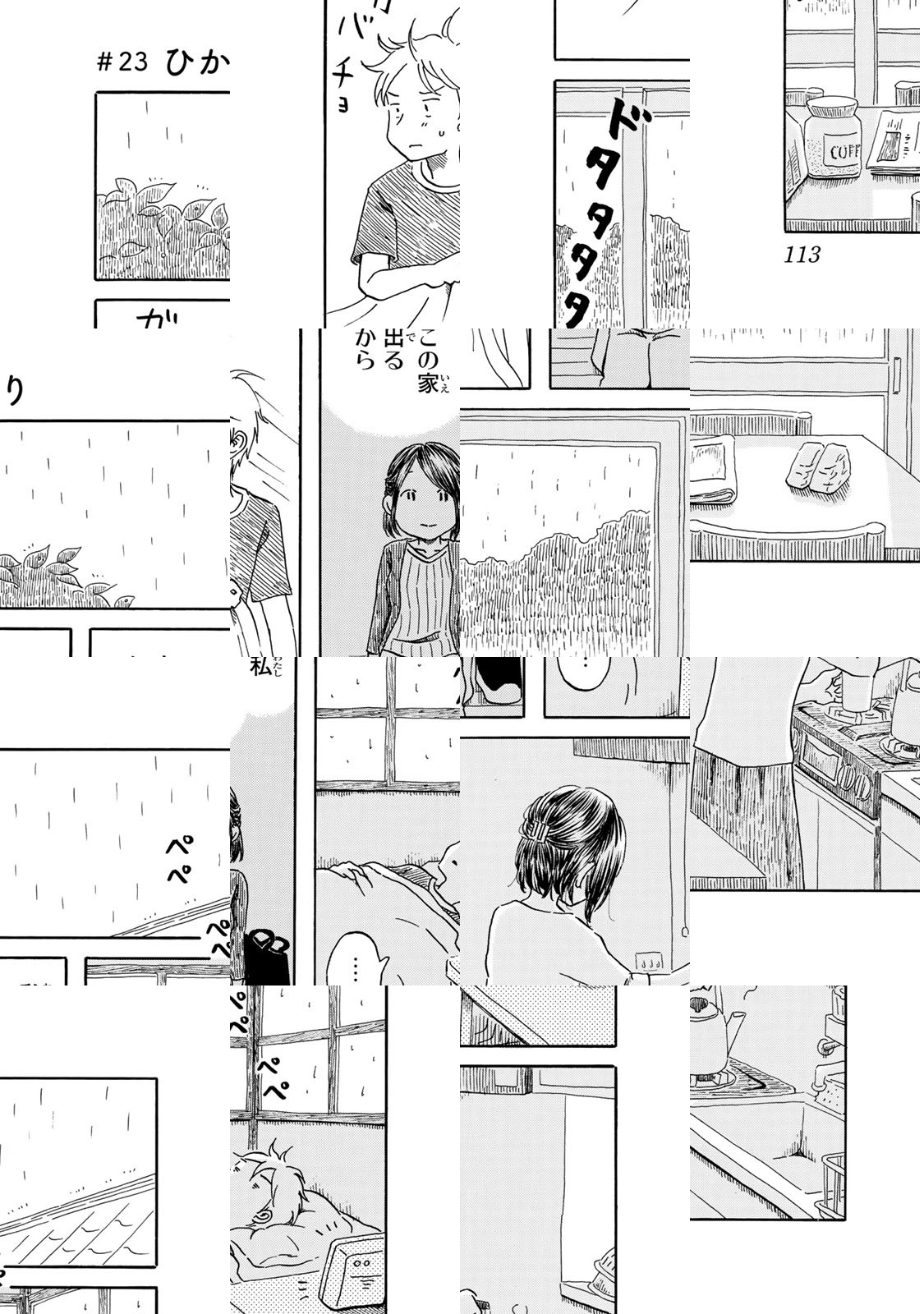 「俺がいなければ、この人の肩が濡れることはなかったのに」高校への進学を機に、おじさんの家に居候することになった直達。だが最寄の駅に迎えにきたのは見知らぬ大人の女性の榊さん。案内された家の住人は26歳OLの榊さんとなぜかマンガ家になっていたおじさんの他にも女装の占い師、メガネの大学教授といずれも曲者揃いの様子。ここに高校1年生の直達を加えた男女5人での一つ屋根の下、奇妙な共同生活が始まったのだが、直達と榊さんとの間には思いもよらぬ因縁が……。久しぶりに始動した田島列島が自然体で描くのは家族のもとを離れて始まる、家族の物語。