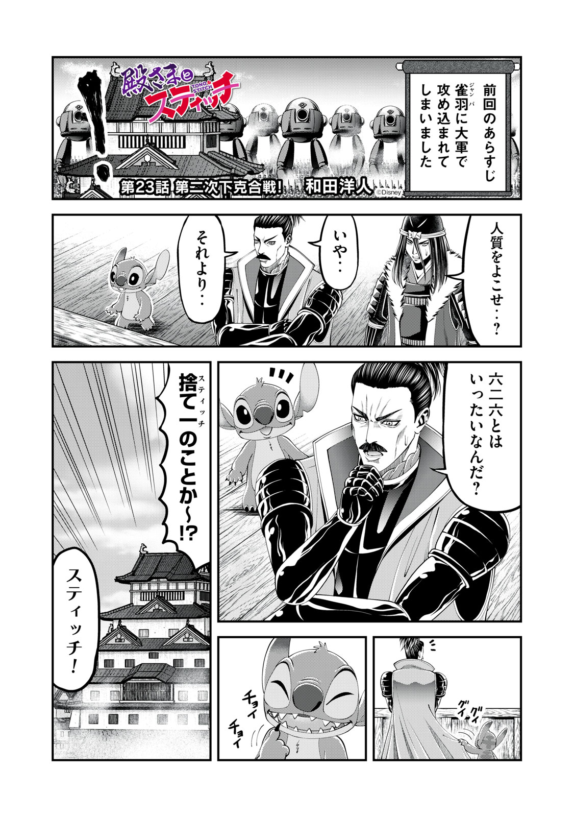 あのスティッチが戦国時代に!? 銀河連邦から命からがら逃亡したスティッチが不時着したのは、ハワイではなく日本。…それも、戦国時代の日本だった! 下剋の国を平らげ、民から恐れられる戦国武将・大和命尊は、空から降ってきたスティッチと遭遇。その姿を見るうち、自らの胸の裡に初めて沸き上がる感情に困惑する。「…可愛い――――。」戦国武将・命尊と宇宙生物・スティッチとの心の交流を描くハートフルコメディ、ここに開幕!