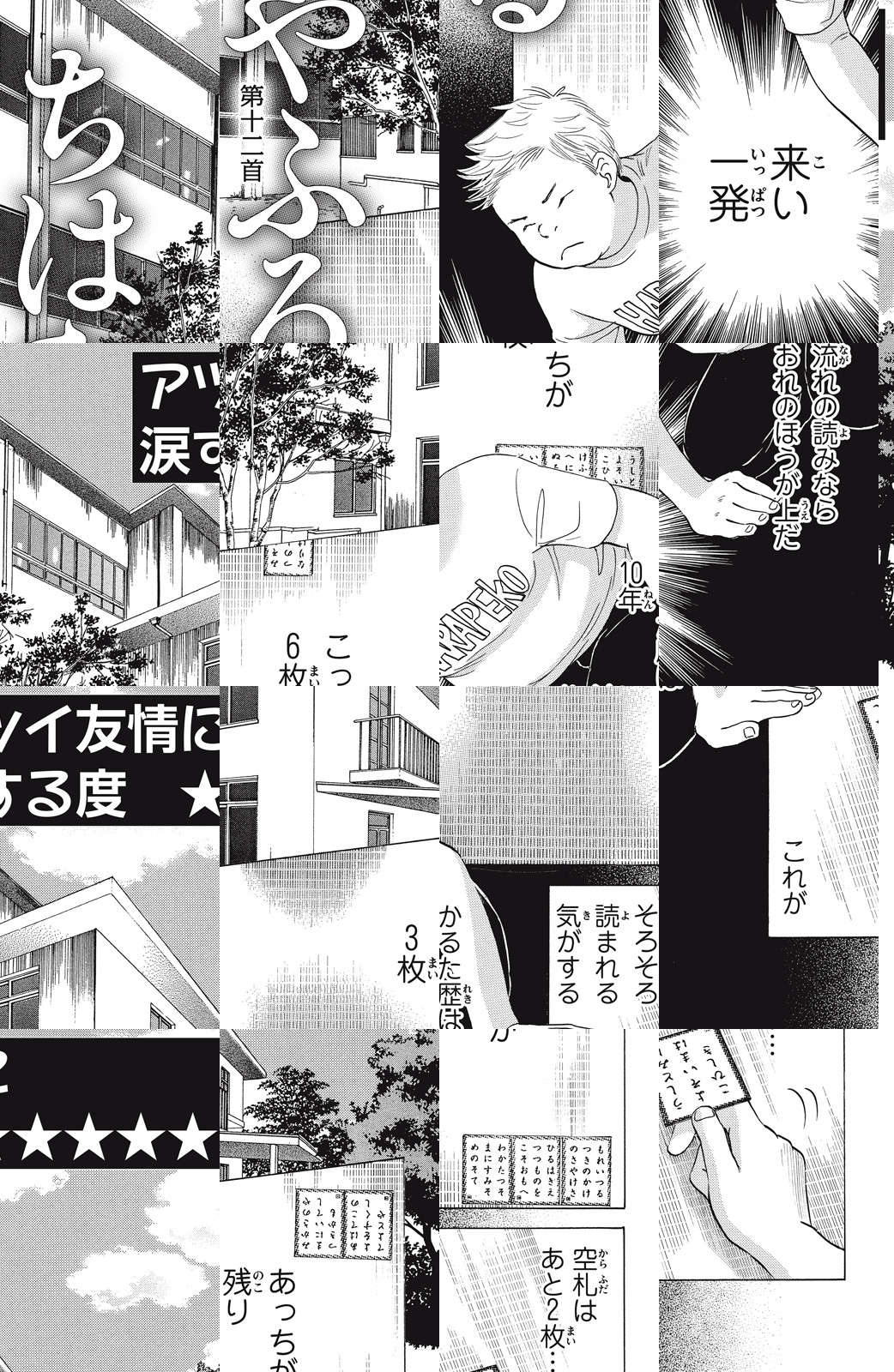 未読の人も既読の人もたのしめちゃう!!『ちはやふる』のアツい名シーンをたっぷり試し読み!豪華ラインナップはこちら→1首 はじまり かるたとの出会いに胸打たれる度★★★★★/12首 仲間 アツい友情に涙する度★★★★★/13首 決戦前夜 胸キュンなければ戦はできぬ度★★★★★/18首 勝利 負けられない戦いに手に汗握る度★★★★★/119首 トライアングル 三角関係にドキドキする度★★★★★