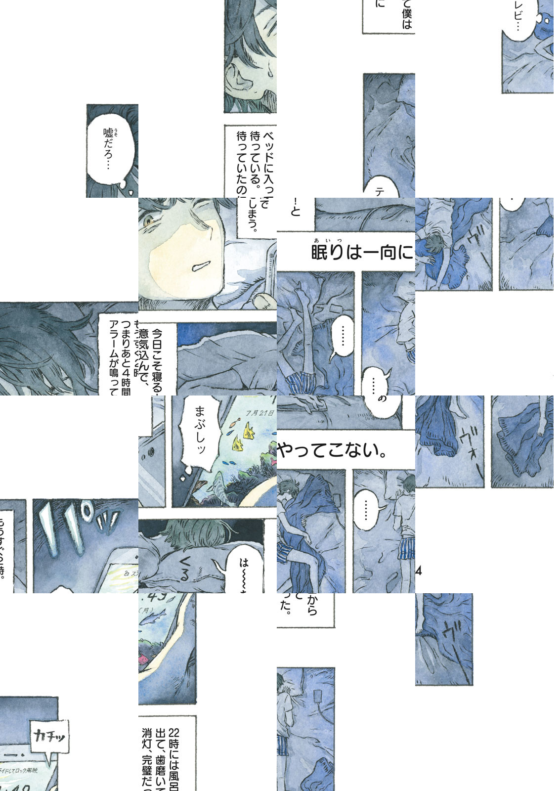 【アフタヌーン四季賞2019冬 四季大賞】日曜の深夜。男は、明日仕事があるにもかかわらず、なぜか眠れない夜を過ごしていた。いろいろと思考を巡らせる中で、一年前に家を出て行った彼女と観た映画のことを思い出す。男は、どんどん「考えごと」に絡めとられてしまい──。