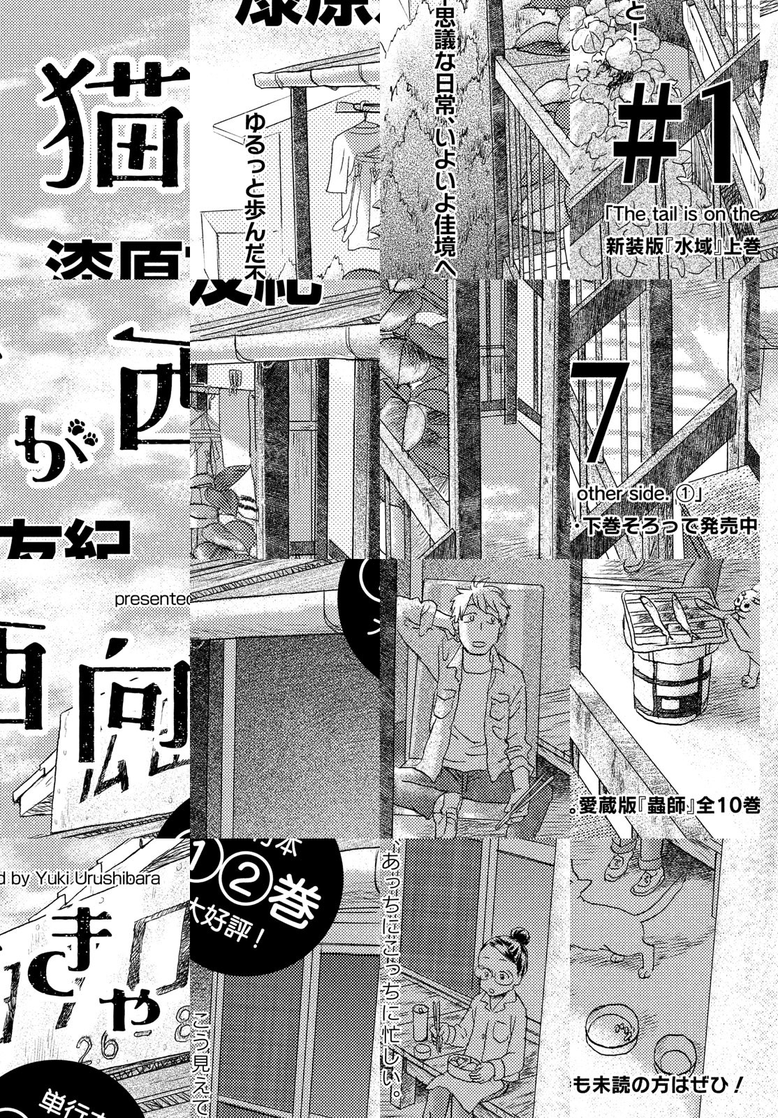 漆原友紀(『蟲師』『水域』)の最新タイトルは、”フロー”と呼ばれる奇妙な自然現象を処理するフロー業者・ヒロタと、アルバイトの智万ちゃん(見ため12歳、実年齢35歳)、そして”しゃちょう”(猫)が贈るストレンジなお仕事活劇! 三叉路が七叉路に増殖してたり、物体のカドがぜんぶ丸くなってたり、鏡の中に鏡反転の世界が生まれてたり。そんな変な光景を見かけたら、それは”フロー”。自然もときどき間違えるのだ。