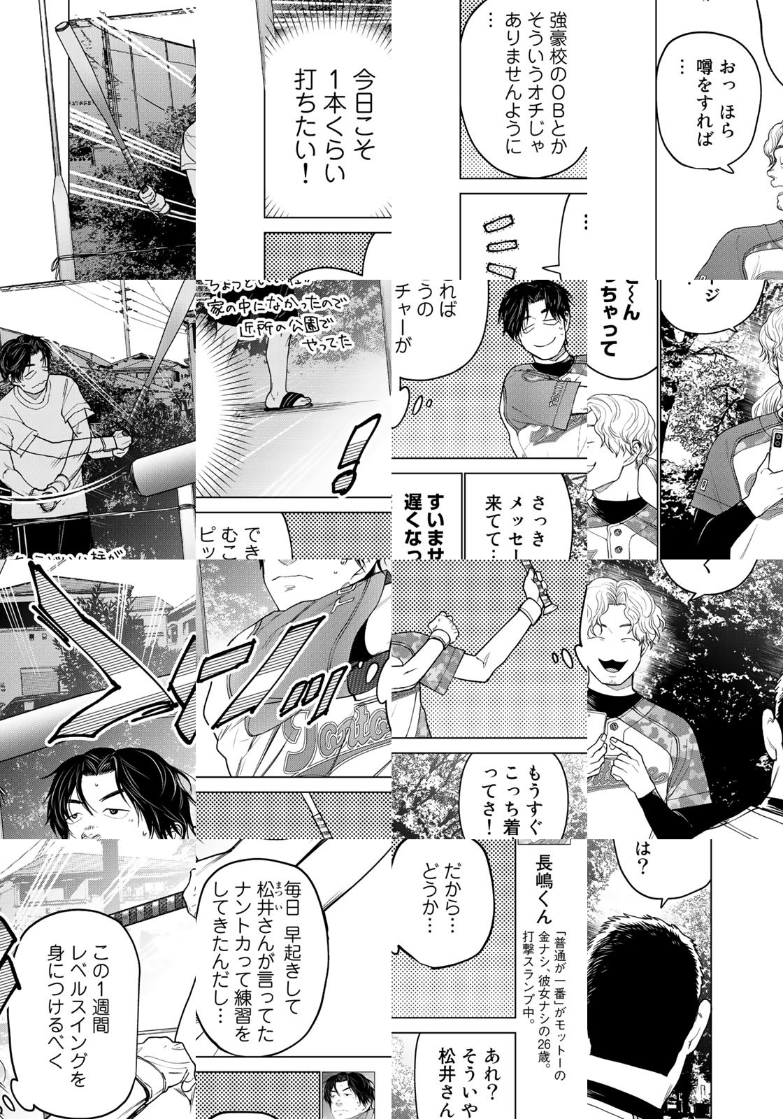 平凡なサラリーマン・長嶋君の趣味は草野球。ある日、チームの助っ人としてグラウンドに舞い降りたのは謎の野球女子・松井さんだった!! その可憐さに敵も味方も浮足立つ中で、松井さんの第一打席は──!?