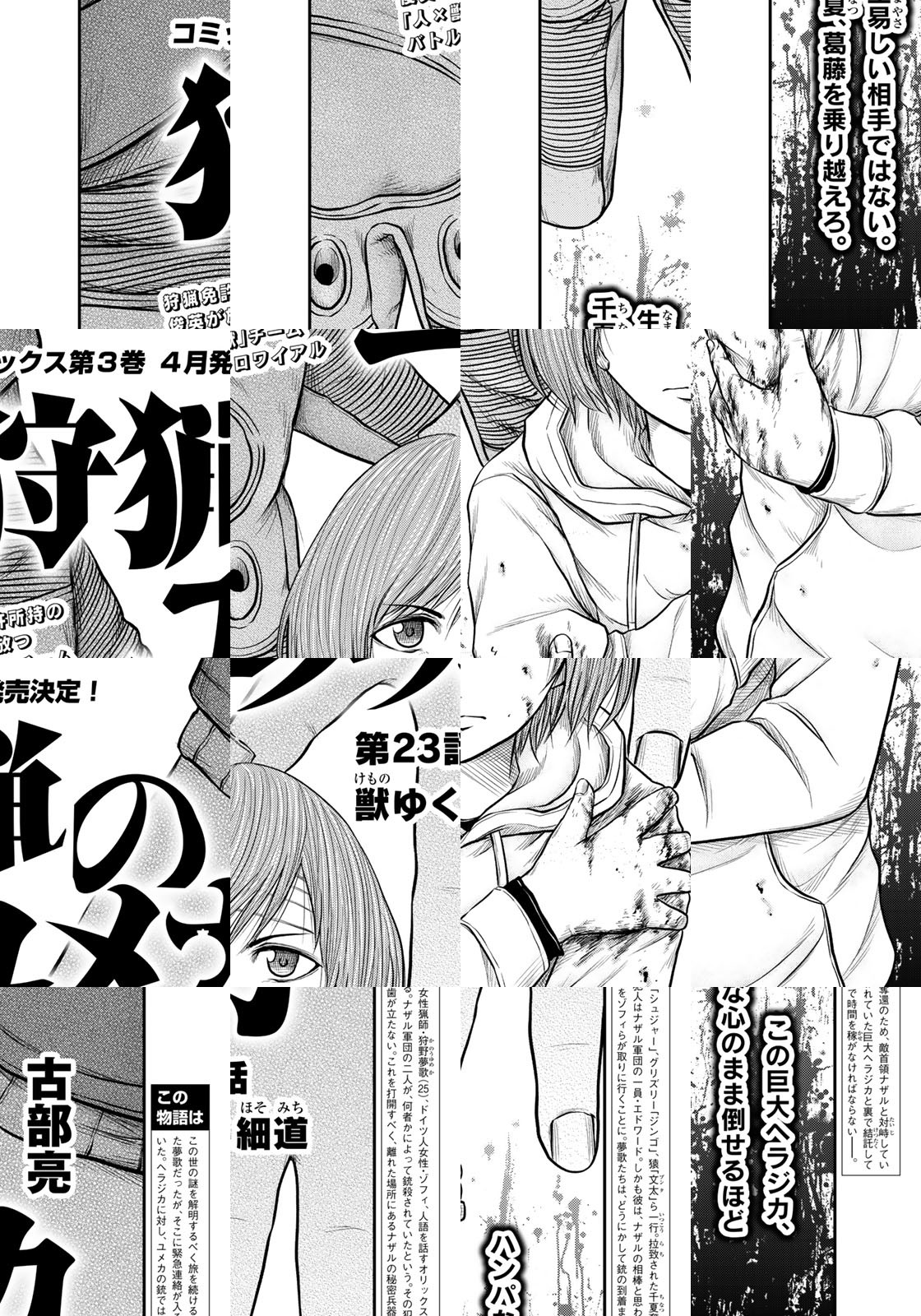 期待の新鋭が描く、「人×獣」異種間チームバトルロワイアル堂々開幕! 突如あらわれた人の言葉を解する獣たち。女性猟師・ユメカがある日突入したのは、獣に対する人の優位性が大きく揺らぐ世界だった。反目しながら、ときに異種間タッグチームとして協力し合い、謎に満ちたこの世界を生き抜くことはできるのか――!?