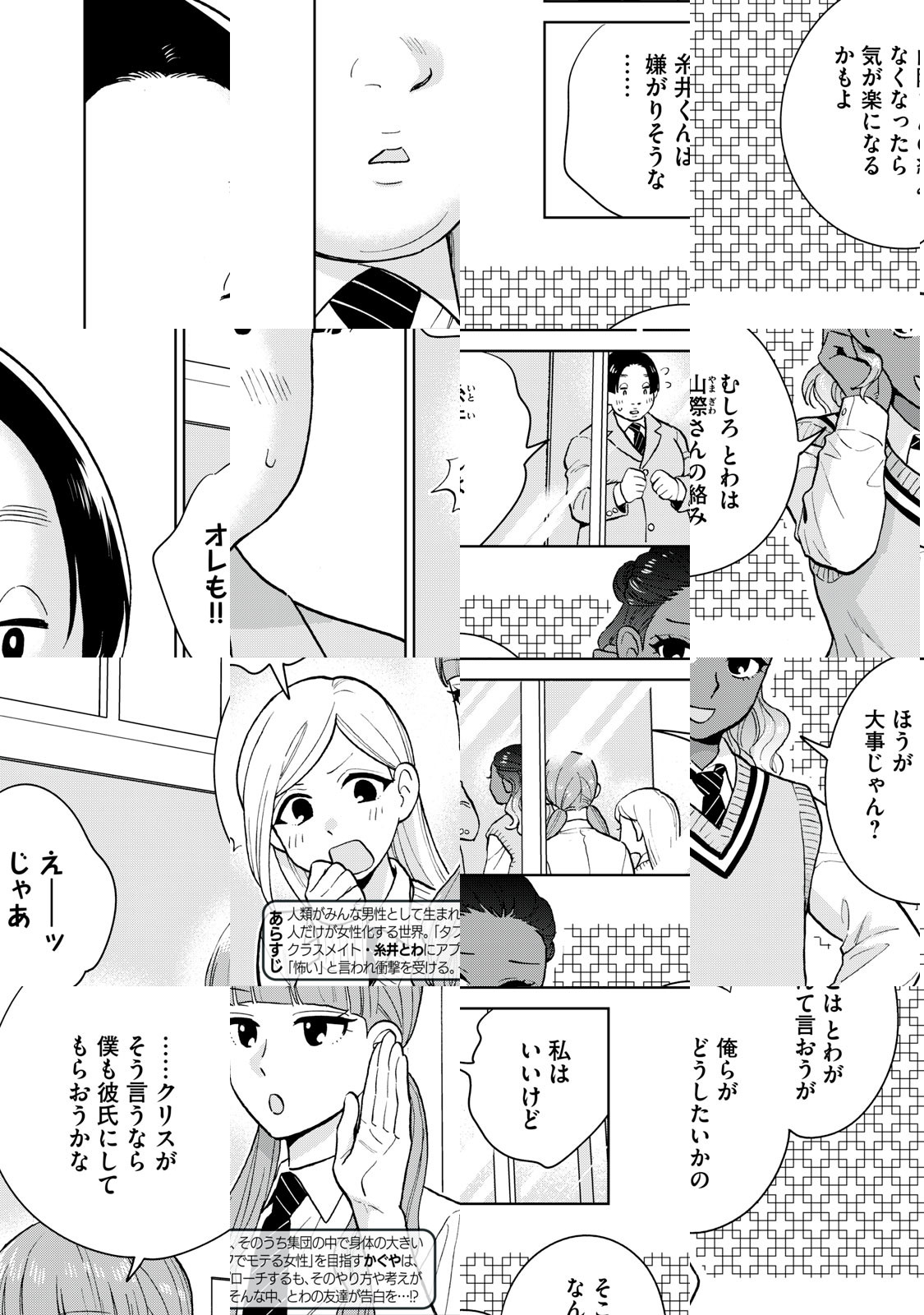 「女の子は、強く賢くかっこよく」「男の子は、おしとやかに可愛らしく」「女の子の仕事は『モテ』と『出産』と『社会のリーダーになること』」「男の子の仕事はそれを全力で支えること」……それがこの世界のアタリマエ。 これは、そんな世界で「性」や「恋愛」や「友情」にぐらぐら揺れる、女の子と男の子たちの物語!