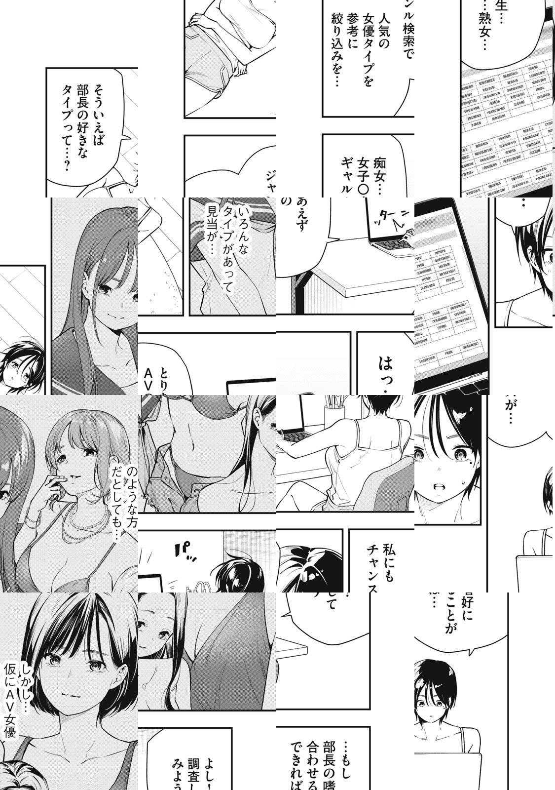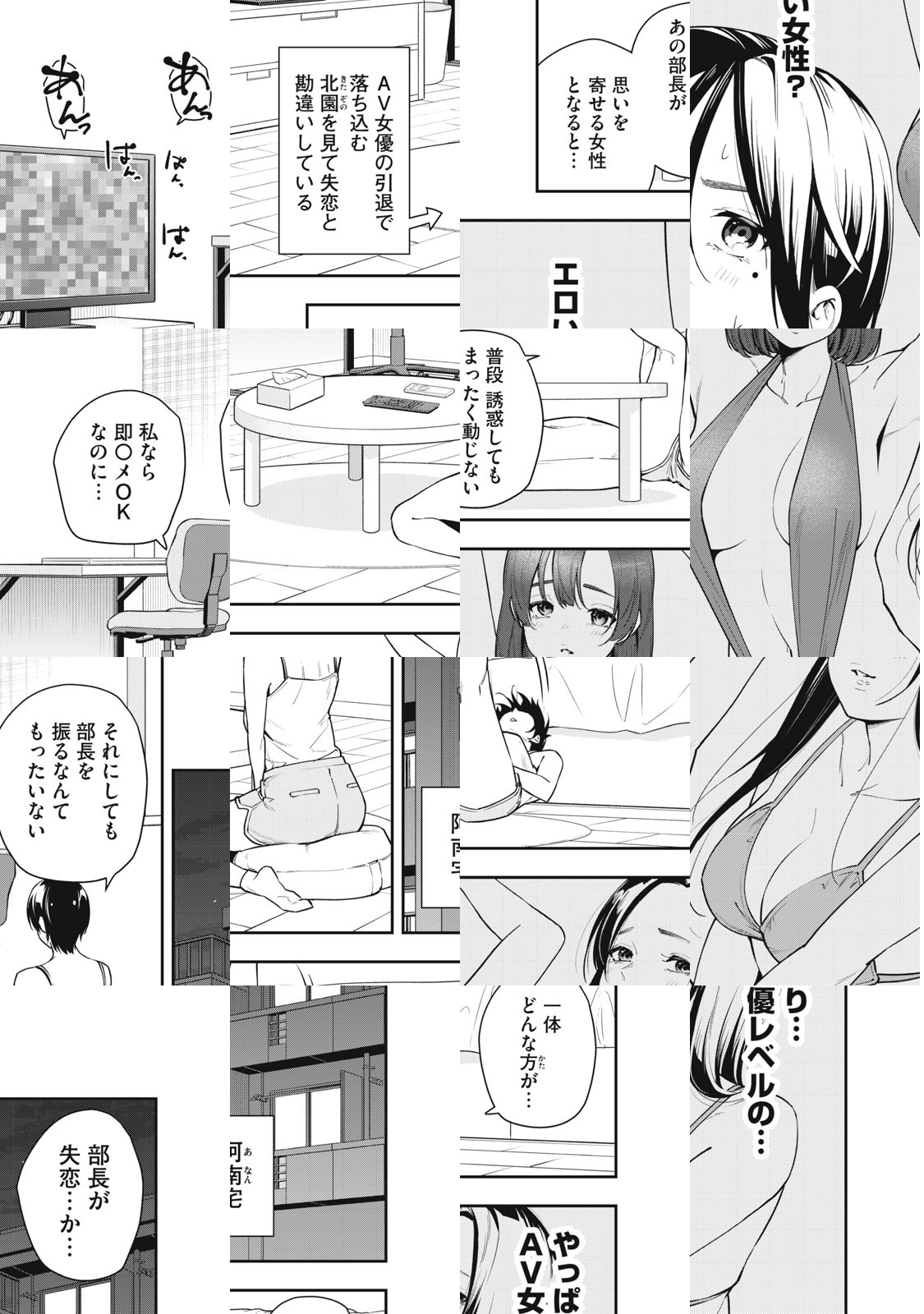 恋愛経験の乏しい阿南さんは、AVを見て知識を得る拗らせOL。憧れの男性である上司の北園部長を落とすべく奮闘するが、ことごとく失敗してしまう。実は北園も童貞を拗らせた、恋愛経験0な男で…。妄想AVラブコメスタート!