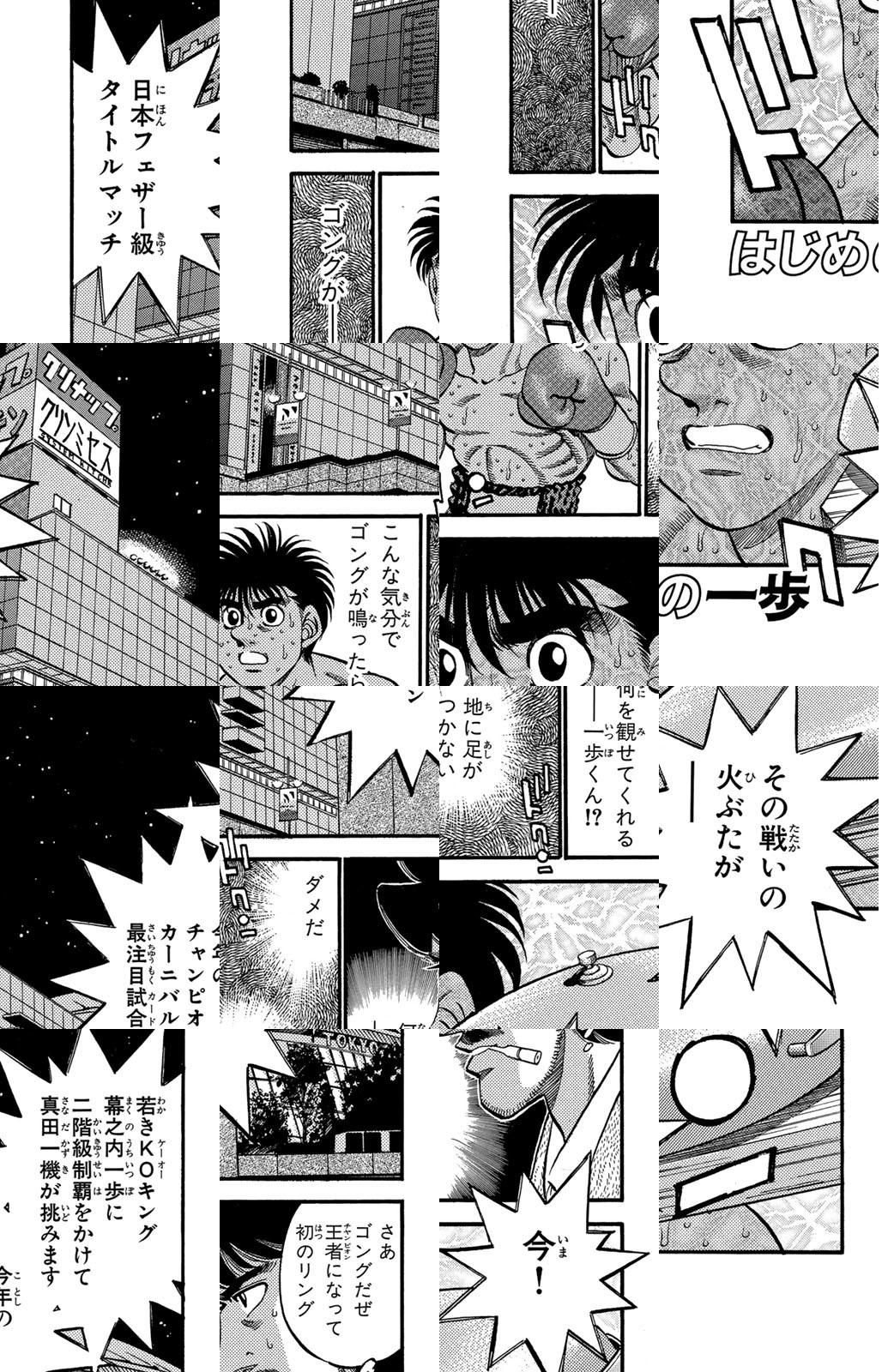 いじめられっ子だった幕之内一歩はひょんなことからボクシングに出会い、熱中していく。一歩は『強いってどういうことだろう?』という素朴な疑問を抱えながら、持ち前の頑張りで過酷な練習に耐え抜き、強くなっていく。数多の強敵との死闘を勝ち抜き、国内屈指のハードパンチを持つ日本王者となった一歩。その次なる目標は遥かなる世界王者への道! 限りなく熱く純粋な一歩のさらなる挑戦が始まった!!ひたむき少年、幕之内一歩登場!!“強い”ってどんなんだろう!?ボクも強くなりたい!!ドジでいじめられっ子の高校生幕之内一歩。ボクサー、鷹村との出会いは、一歩の拳にひそむダイナマイトパンチを呼び起こした!!プロボクサーへの夢を抱いた一歩は、鴨川ジムの入門テストに挑戦(チャレンジ)するが!?