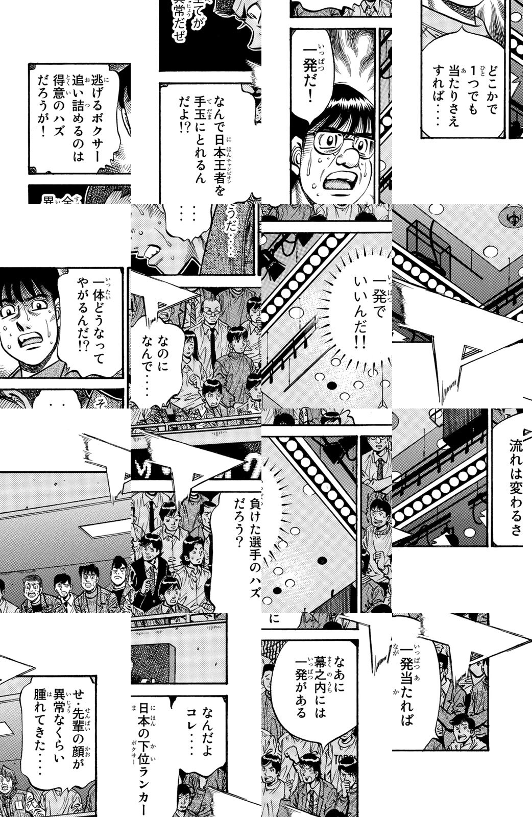 いじめられっ子だった幕之内一歩はひょんなことからボクシングに出会い、熱中していく。一歩は『強いってどういうことだろう?』という素朴な疑問を抱えながら、持ち前の頑張りで過酷な練習に耐え抜き、強くなっていく。数多の強敵との死闘を勝ち抜き、国内屈指のハードパンチを持つ日本王者となった一歩。その次なる目標は遥かなる世界王者への道! 限りなく熱く純粋な一歩のさらなる挑戦が始まった!!ひたむき少年、幕之内一歩登場!!“強い”ってどんなんだろう!?ボクも強くなりたい!!ドジでいじめられっ子の高校生幕之内一歩。ボクサー、鷹村との出会いは、一歩の拳にひそむダイナマイトパンチを呼び起こした!!プロボクサーへの夢を抱いた一歩は、鴨川ジムの入門テストに挑戦(チャレンジ)するが!?