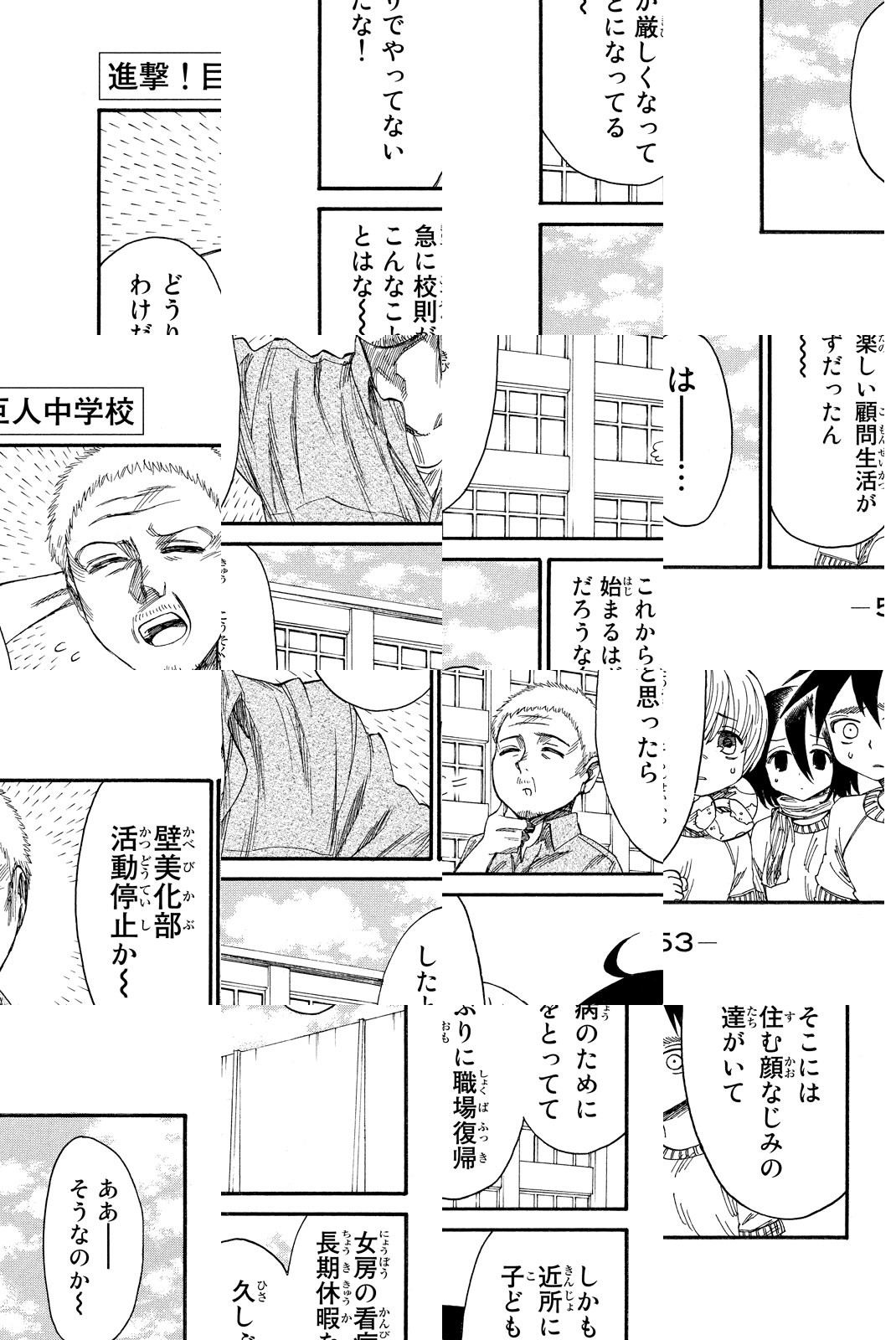 人間と巨人がともに通う「進撃中学校」に入学したエレンとミカサ。しかし、5年前のある事件がきっかけで、エレンは巨人を憎んでいた。その忌まわしき事件とは‥‥!? エレンとミカサとリヴァイと巨人が全員、同中!? 『進撃の巨人』の公式スピンオフコメディ!人間と巨人がともに通う「進撃中学校」に入学したエレンとミカサ。しかし、5年前のある事件がきっかけで、エレンは巨人を憎んでいた。その忌まわしき事件とは‥‥!? エレンとミカサとリヴァイと巨人が全員、同中!? 『進撃の巨人』の公式スピンオフコメディ!