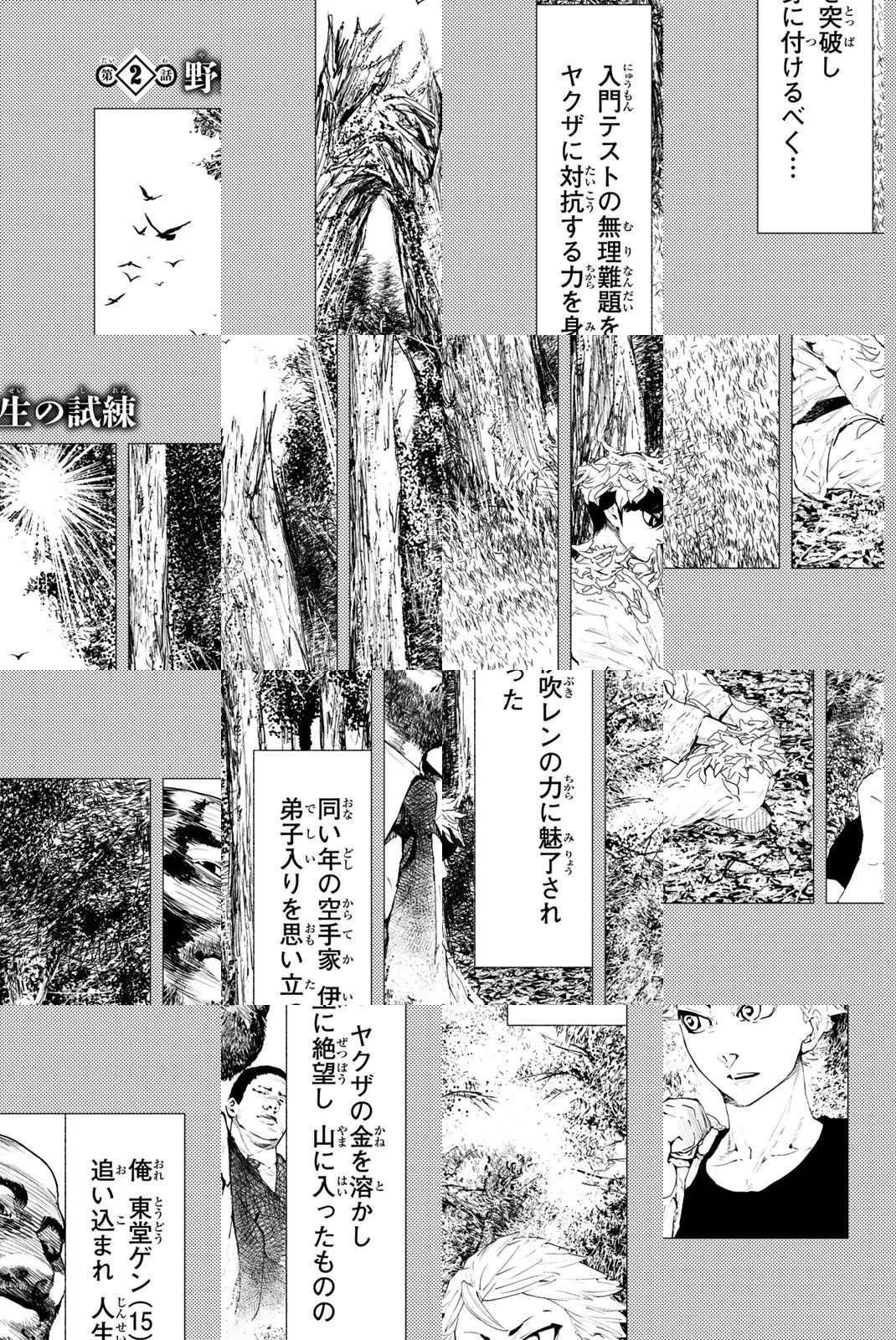 親に見放され、ヤクザから借りたお金も溶かした15歳の少年・東堂ゲンは、自殺をするために訪れた山奥で、たった一人で空手の修業に励む伊吹レンと出会う。圧倒的強さを誇るレンに魅せられたゲンは弟子入りを志願するも、山の中でレンを狙う刺客の攻撃を喰らって瀕死状態に陥る。臨死体験を経て己の限界を超えた力を発揮できる肉体へと変貌を遂げたゲンはレンに認められ、もう一人の若き弟子・烏丸テンマとともに空手道を極める日々を歩みだす!異国の殺し屋や伊吹流根絶を狙う空手組織相手の破格のバトルがここに開幕!!