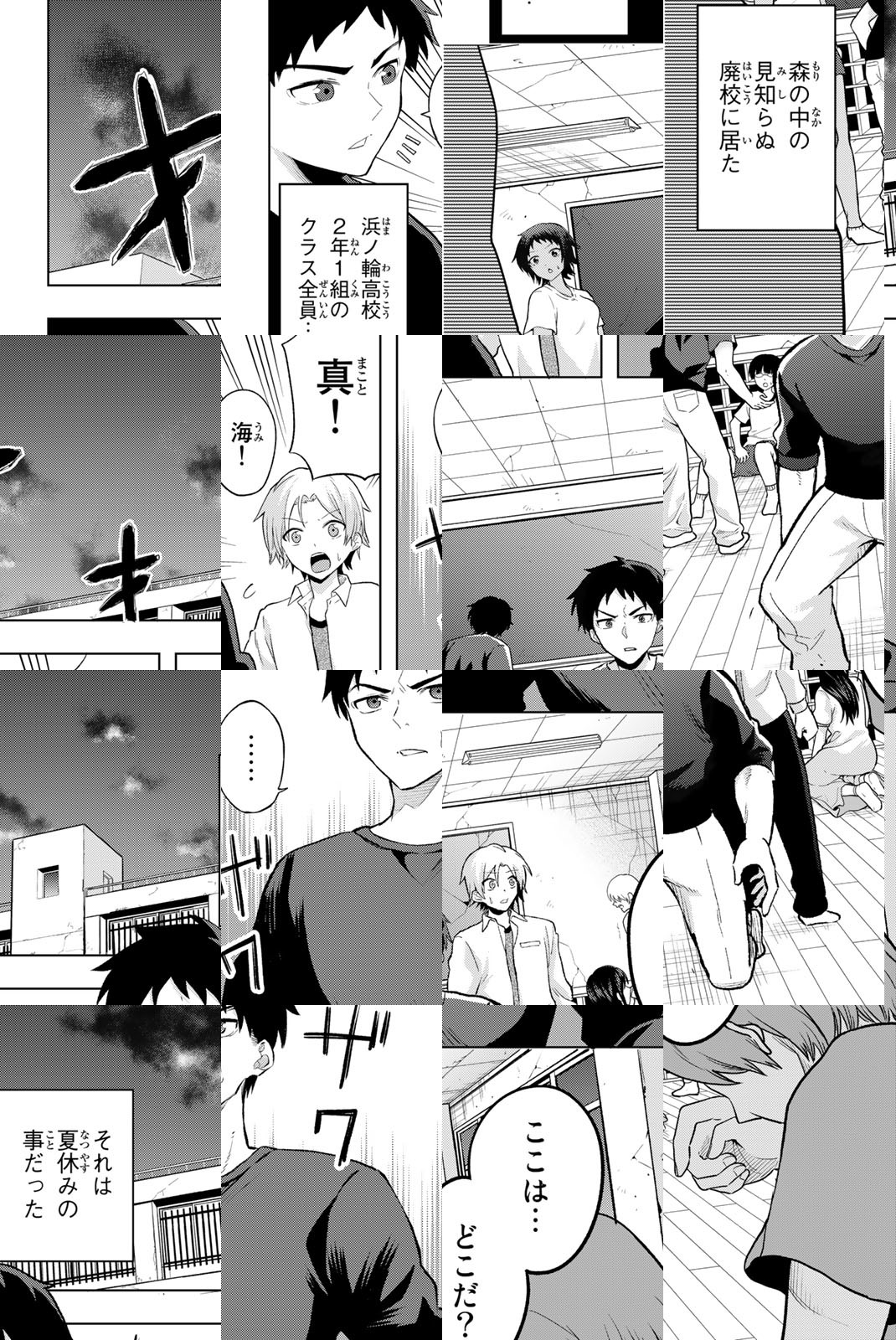 浜ノ輪高校2年1組の生徒達は、ある日目覚めると見知らぬ廃校の中にいた!! 状況がつかめぬ最中、突然教室には黒服の男達が現れ「デスゲーム」の開始が告げられる!! 絶体絶命と思われる中、体力オバケ・新堂真は、気高きお嬢様・早乙女麗華とゲームに立ち向かうが…このゲーム「何か」がおかしい!? 世界で一番平和で、幸せなデスゲームがいま始まる!!