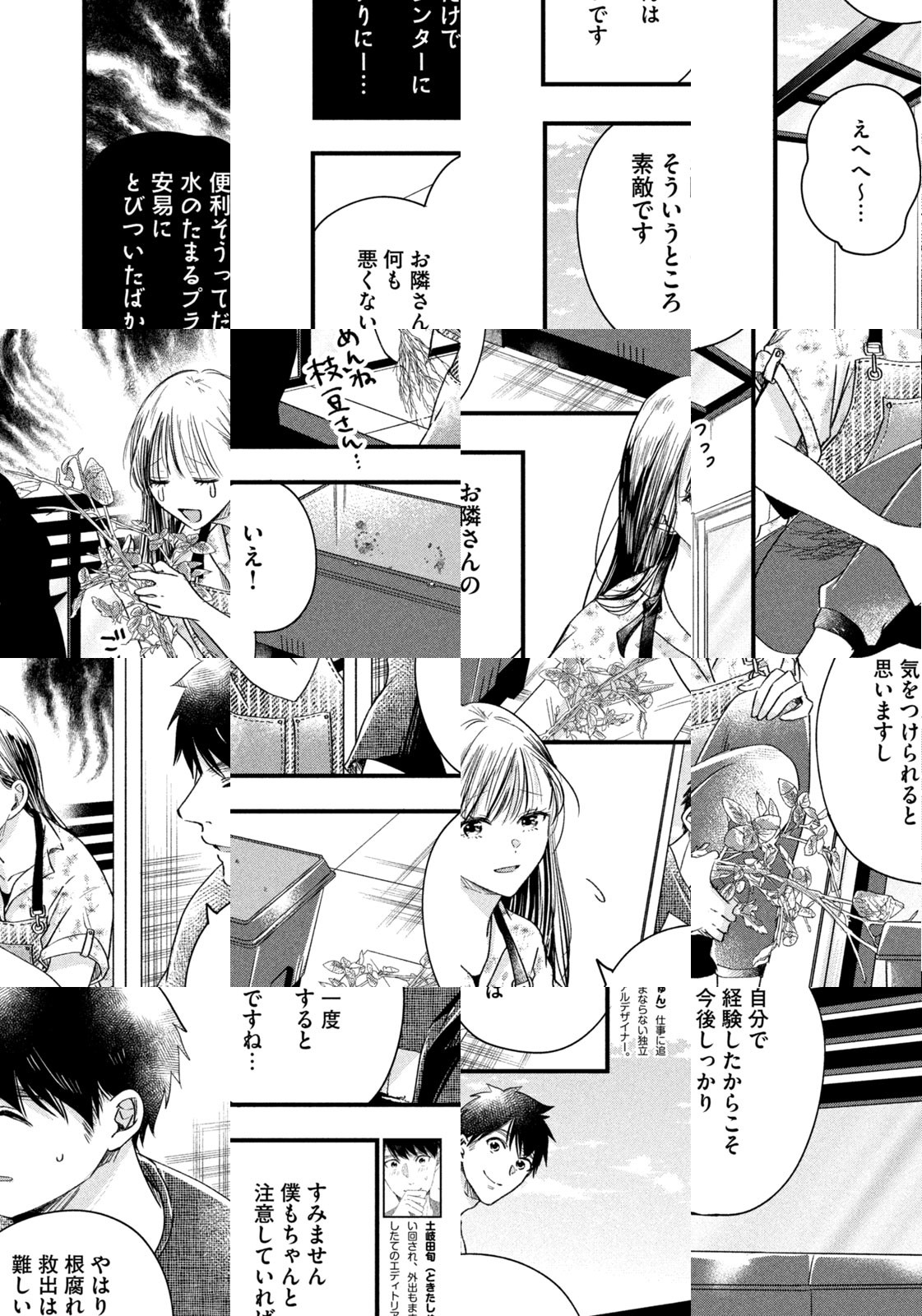 フリーのエディトリアルデザイナー・土岐田旬は、仕事に追われ部屋に籠りっぱなしの毎日。癒やしを求めてベランダガーデニングにハマるように。そんなある日、隣にちょっと変わった天然系の女性が引っ越してきた。ふとした出来事から、お互いの顔も知らぬままベランダの隔壁越しに話をするようになる二人。実は隣の女性は新進俳優・成海游なのだが……。ベランダとグリーンが繋ぐ隔壁越しの二人は?