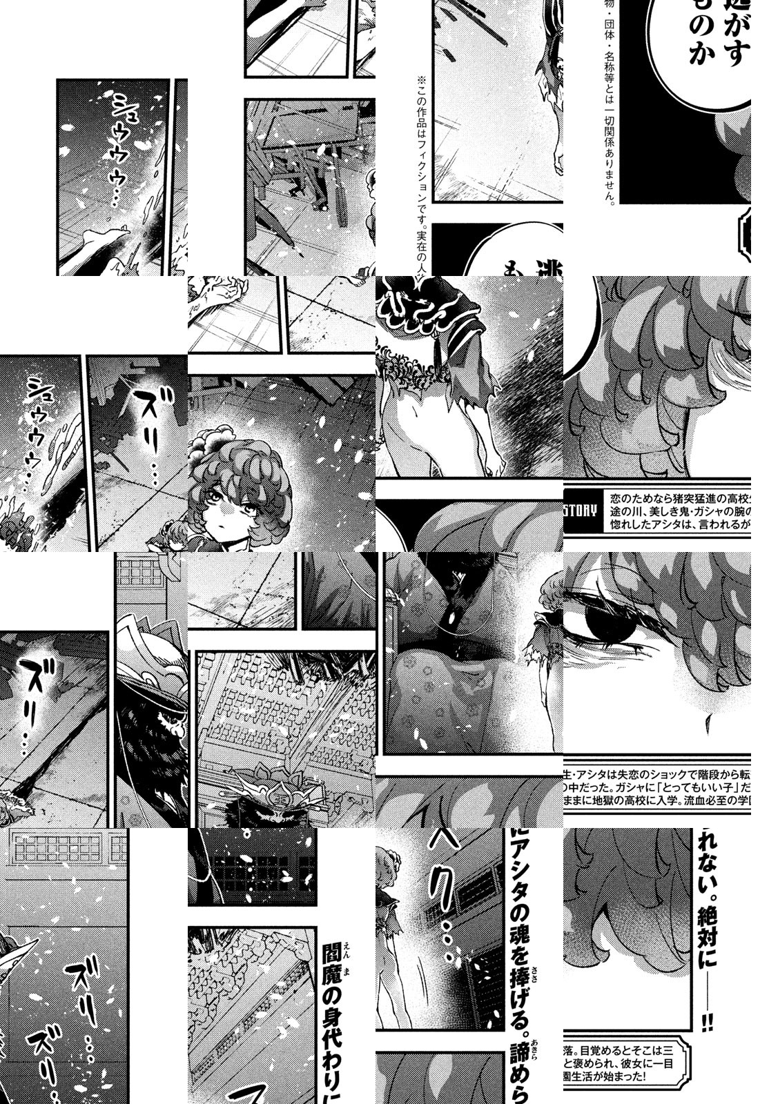 恋のためなら猪突猛進の高校生・アシタは失恋のショックで階段から転落。目覚めるとそこは美女の腕の中、あの世へと向かう舟の上だった。美女・ガシャに優しく慰められたアシタは、言われるがままに地獄を見学。ガシャが校長を務める鬼の学校に入学することに……! 欲望に忠実すぎる鬼達の中に放り込まれ、流血必至の学園生活が始まった!
