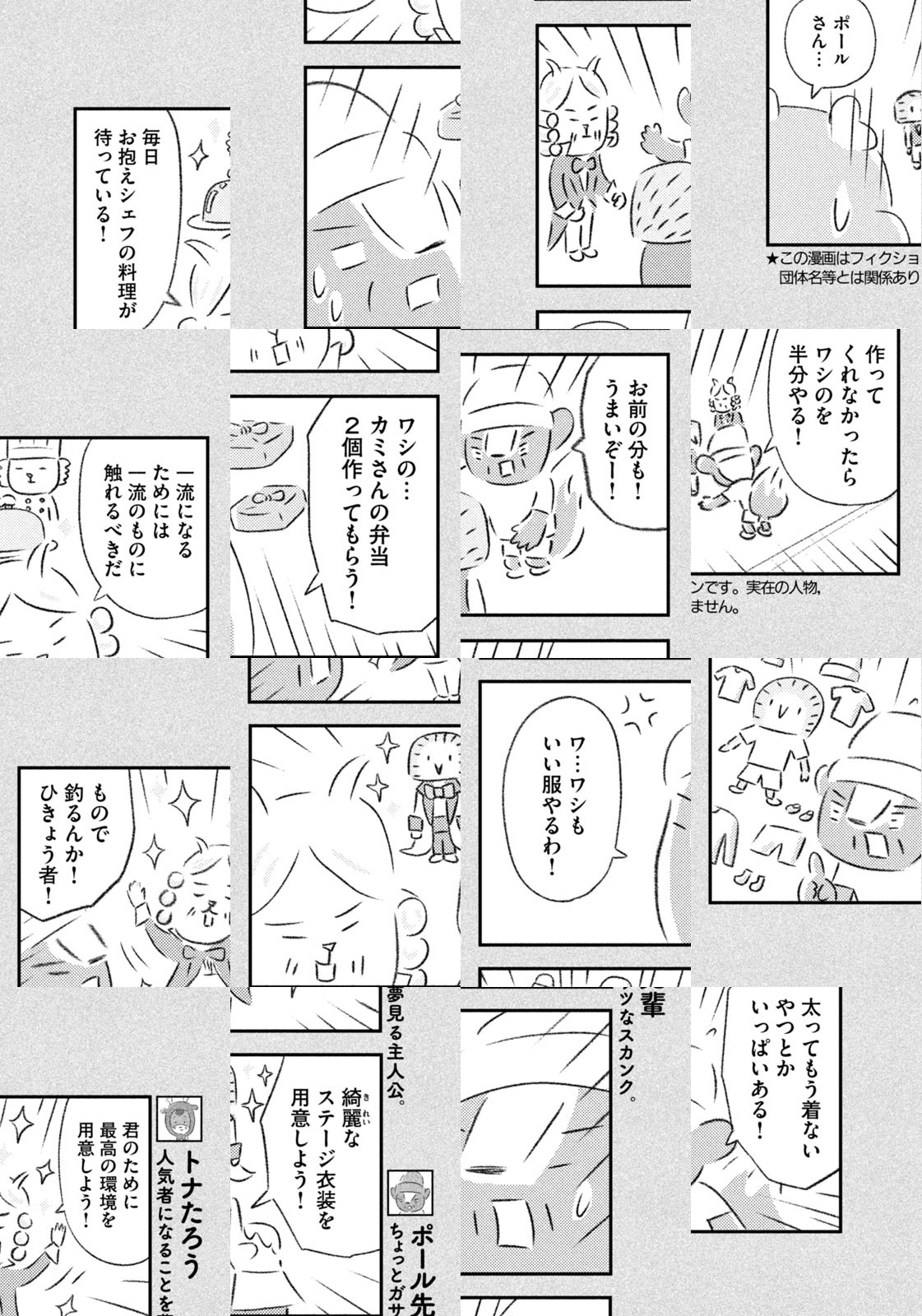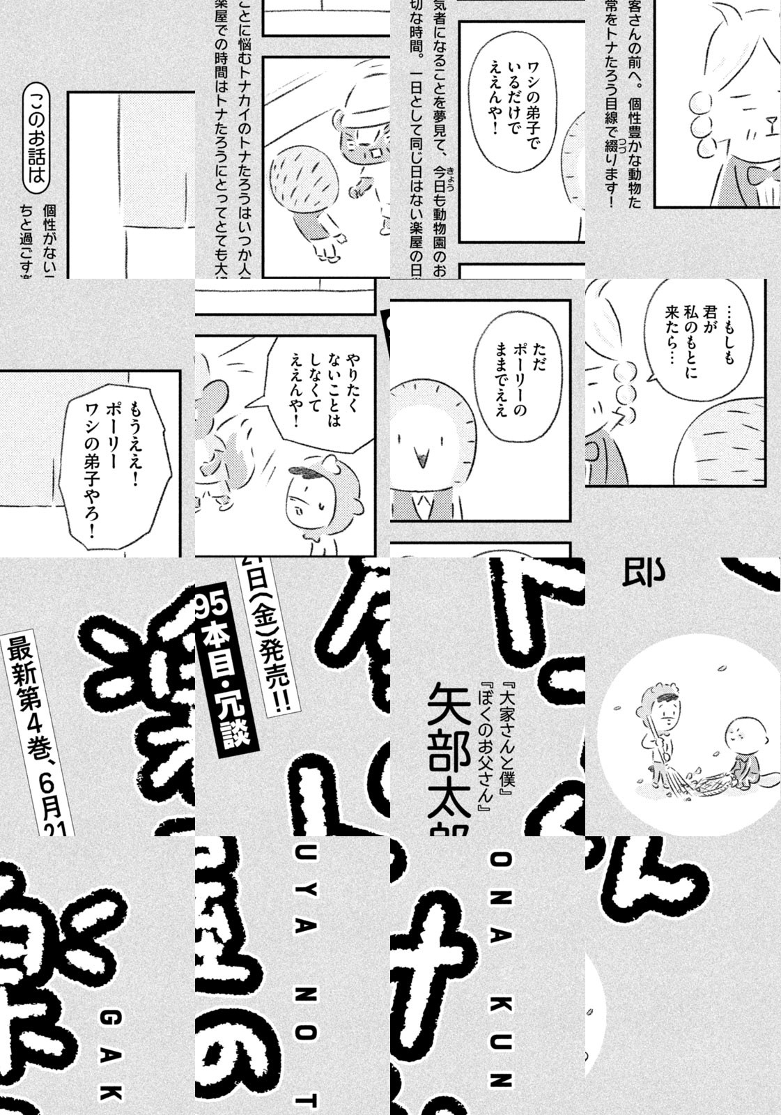 先輩にはいびられ、後輩には舐められ、お客さんには気づかれない主人公・トナカイのトナたろう、ちょっとガサツでデリカシーのないスカンクのポール先輩、元気すぎるお猿のアーコ、大人気のパンダくんなど、どこか見たことあるような動物たちの楽屋での悲喜こもごもなアニマル賛歌。自分の才能や“動物関係”に今日も悩みながら切磋琢磨する動物たちの舞台裏を覗いてみませんか?