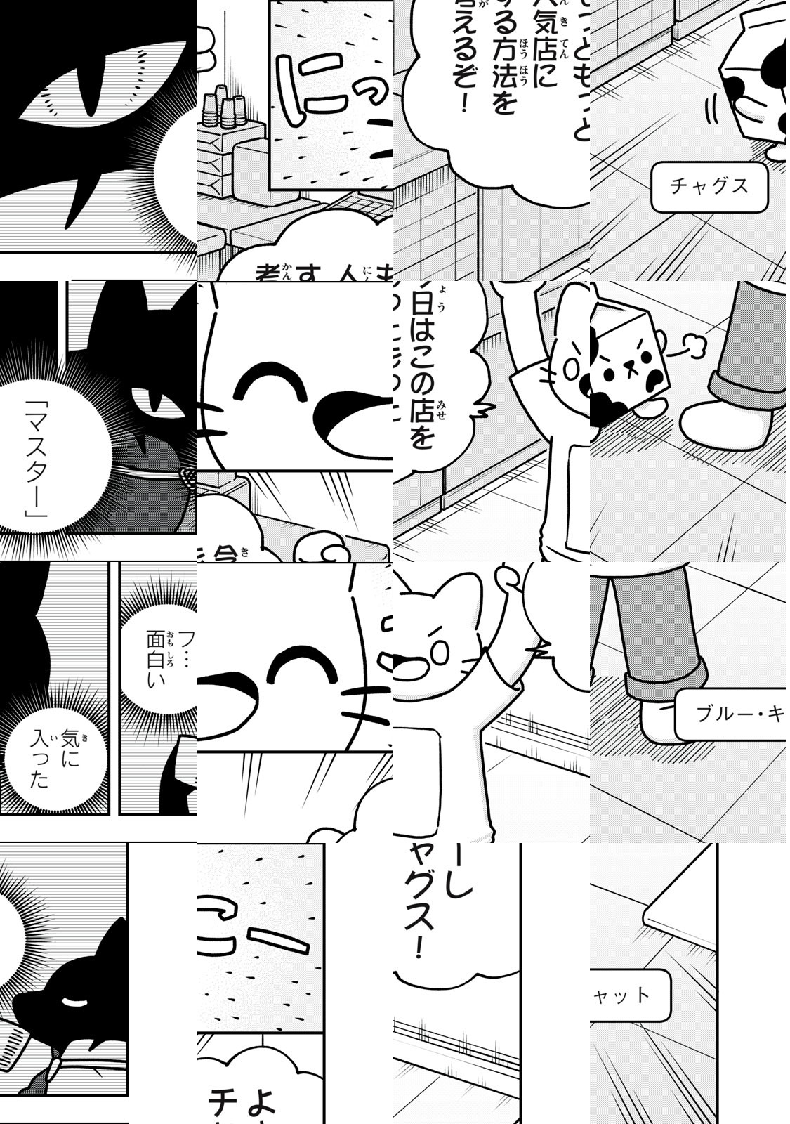 サファイアタウンにあるコーヒーショップ「ザ・ミルクチャグ」は、ブルー・キャットが相棒のチャグスとともに経営するお店。美味しいコーヒーを淹れて、お客さん一人一人に楽しいラテアートを提供する場所であり、友達のジョーやアーディとおしゃべりをしたりして愉快な日常を過ごす場所。「どんなお客様でも大歓迎」なものだから、何かとミステリアスなキラまでやってきて、ハチャメチャな大騒ぎが起きて…!?