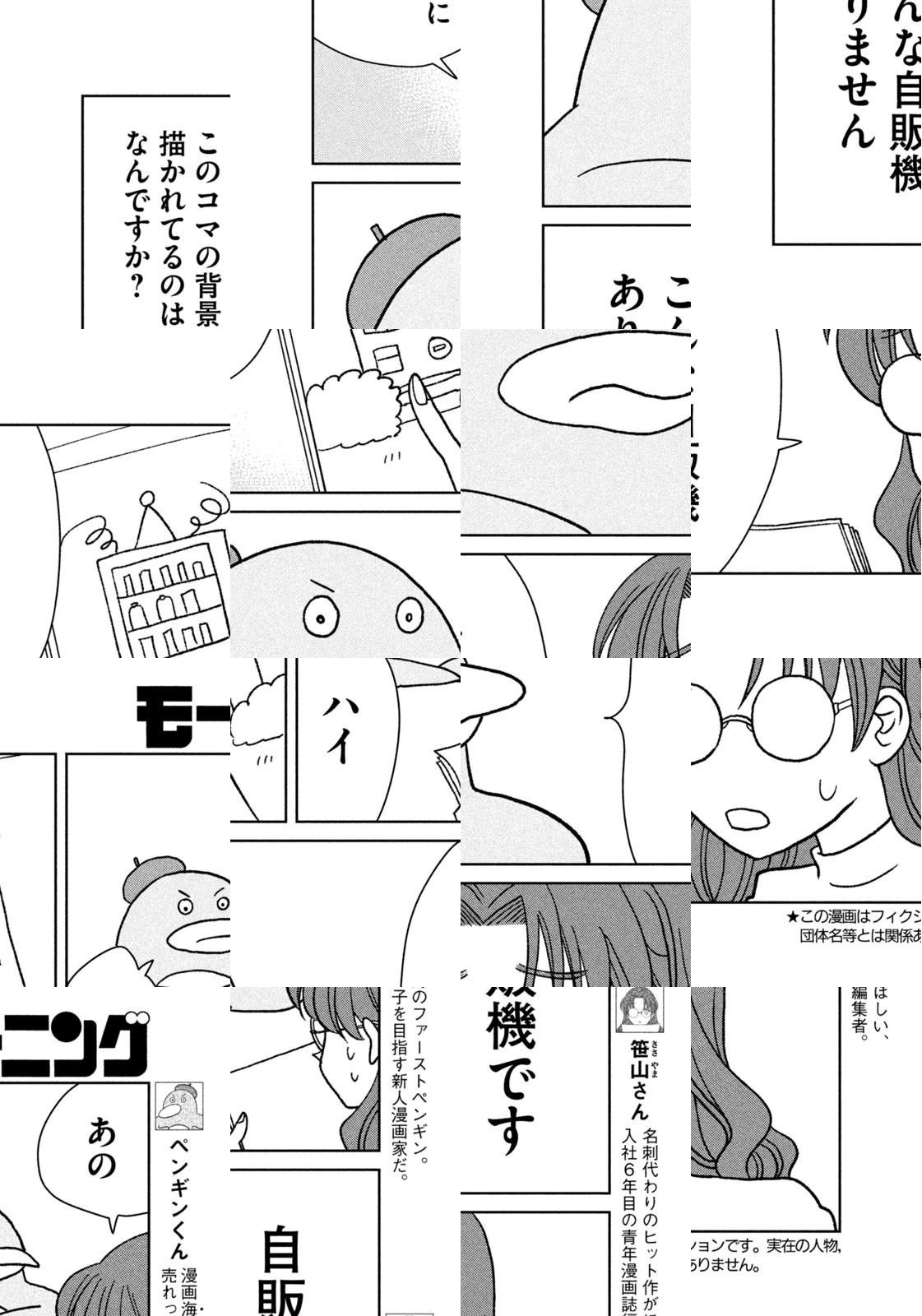 ある日、青年漫画編集者の笹山さんの元に持ち込みに来た新人は、なんとペンギンだった! ペンギンに漫画が描けるの? ペンを持てるの?? どうやって??? ペンギンくんと笹山さんの、まんが界で天下を目指す‶まんが道″が今、はじまるーー!!