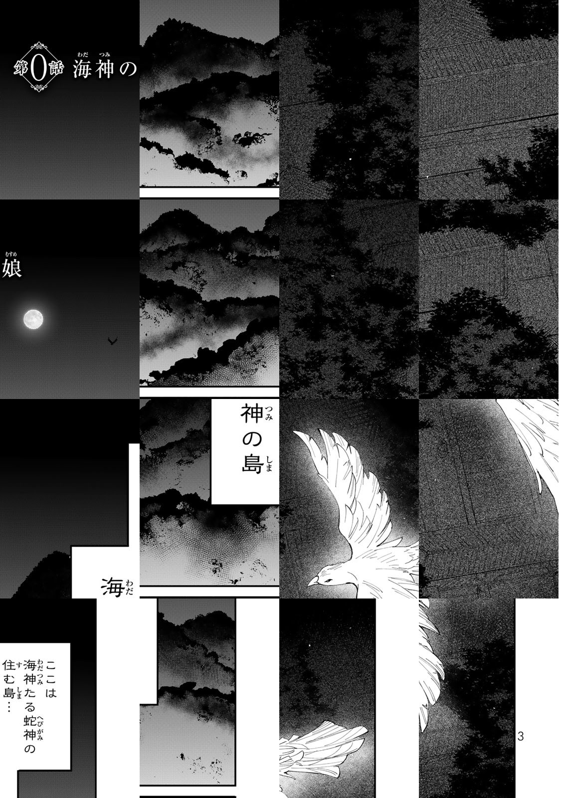 世界の南の端にある「花勒(かろく)」「花陀(かだ)」「雨果(うか)」「沙文(しゃもん)」の四つの島。それぞれの島を治める領主は、海神(わだつみ)の託宣により選ばれた『海神の娘』と呼ばれる娘を娶ることとなる。この娘たちを娶ることにより、島は海神の加護を得て、繁栄するのだという。海神(わだつみ)の託宣により、花勒(かろく)の若き領主・啓(けい)のもとに嫁ぐこととなった蘭(らん)。しかし彼女は、花勒の先代領主・榮君(えいくん)に父を処刑された過去を持っていた。己の肉親を殺した男の息子に嫁がねばならぬ運命に不安を抱えながら、蘭は月明かりの下、小舟で婚儀に向かう———。
