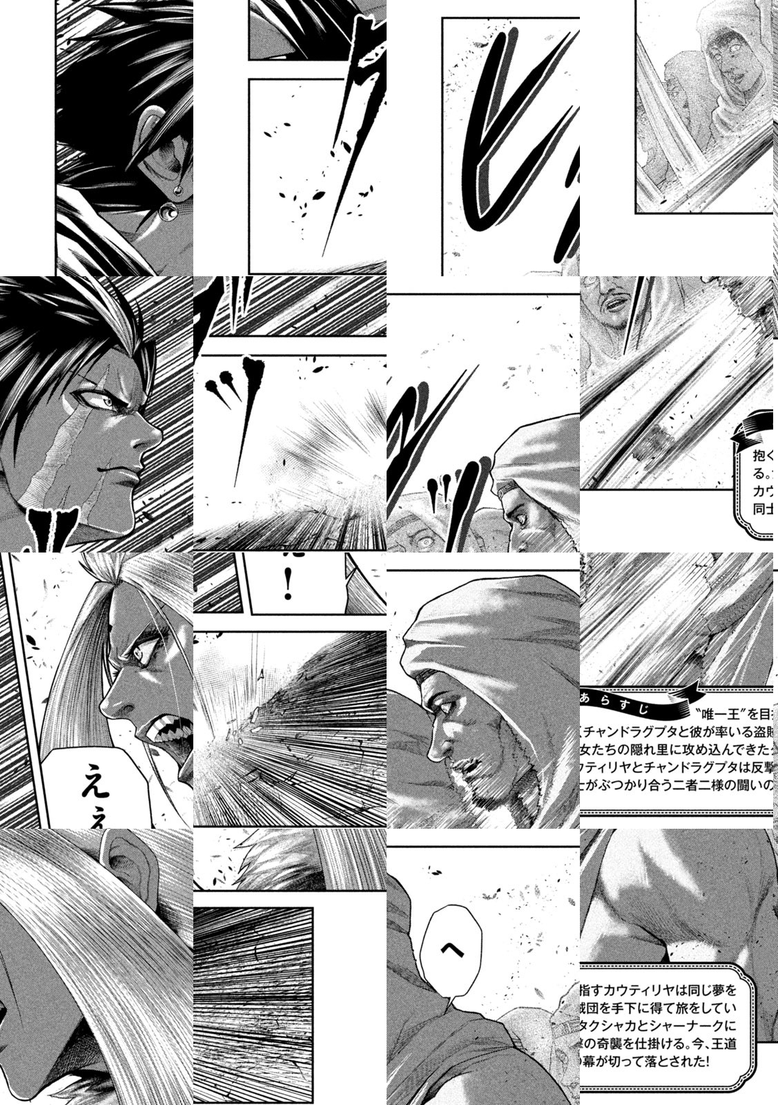 「私は必ず王に成る」――舞台は数多の国々がしのぎを削って争い合う動乱の古代インド。激動の時代に終止符を打つ“唯一王”を目指すのは、知略に長けつつも野心に満ちた隻眼の青年カウティリヤと、圧倒的カリスマ性と武威を誇り盗賊団を率いるチャンドラグプタ。満月の夜に出逢った二人の英雄はインド統一を目指す“王道”への第一歩を歩み始める――“王の器”を持つ男達の闘いを描く歴史ロマンが幕を上げる!!