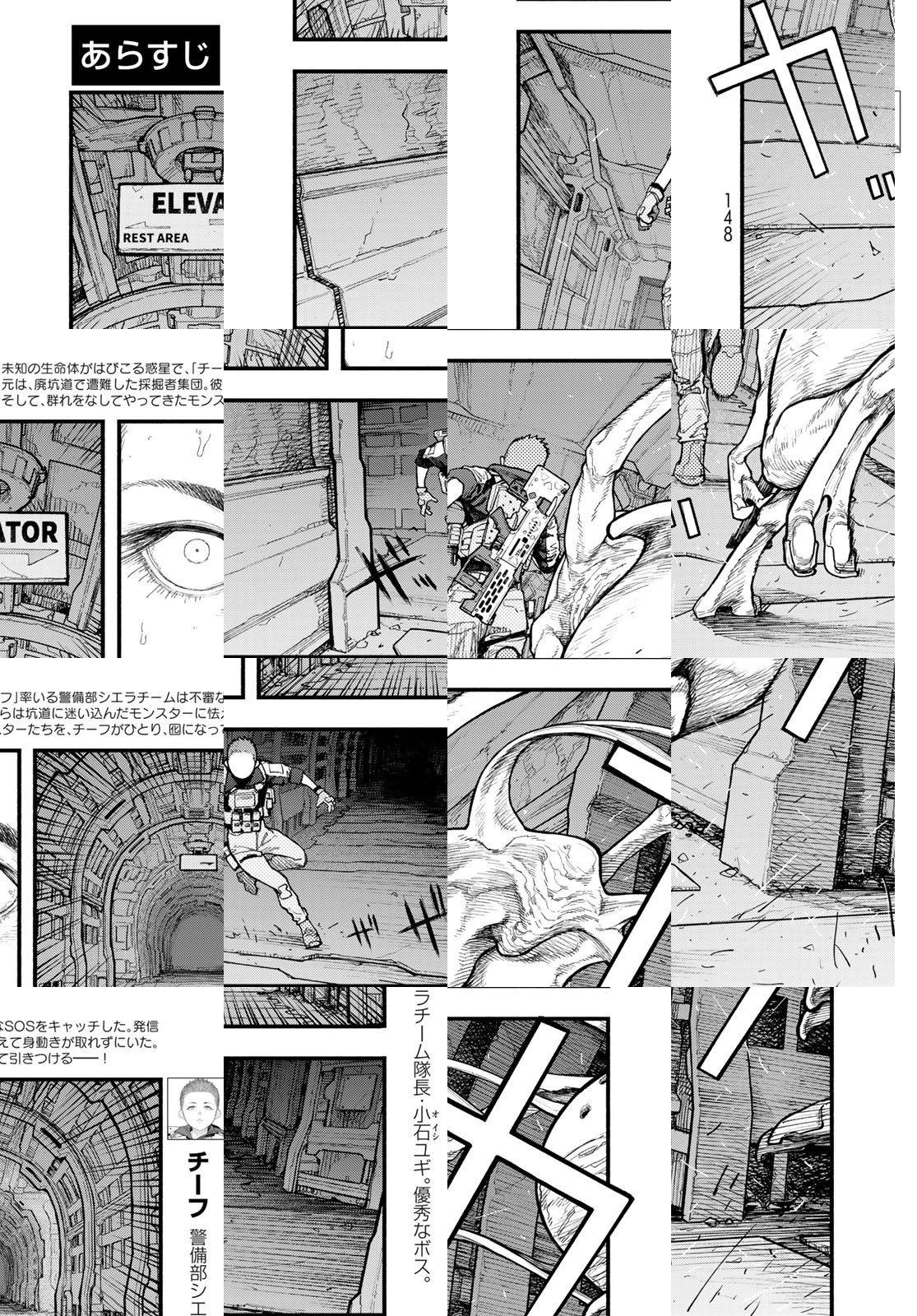 『亜人』の桜井画門が世界に放つSFアクション! 未知のモンスターがはびこる惑星で、「チーフ」率いる舞台は不審なSOS信号をキャッチした。発信元の廃坑道で、何かにおびえる遭難者集団を発見する――。