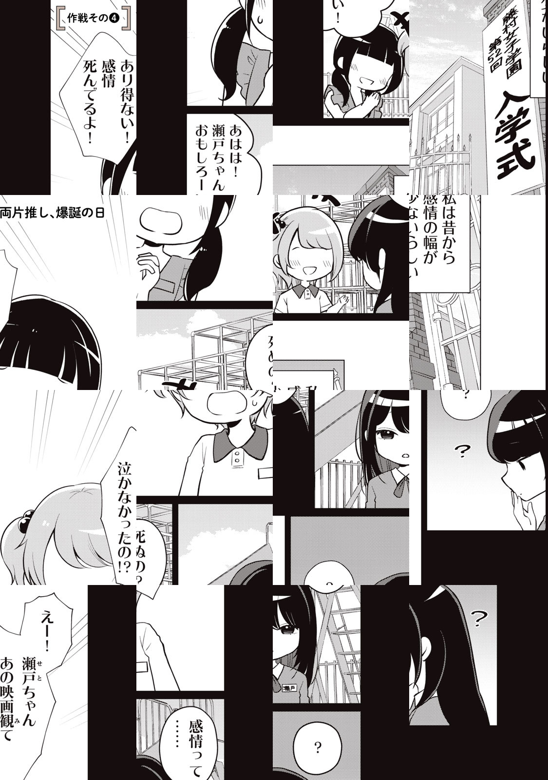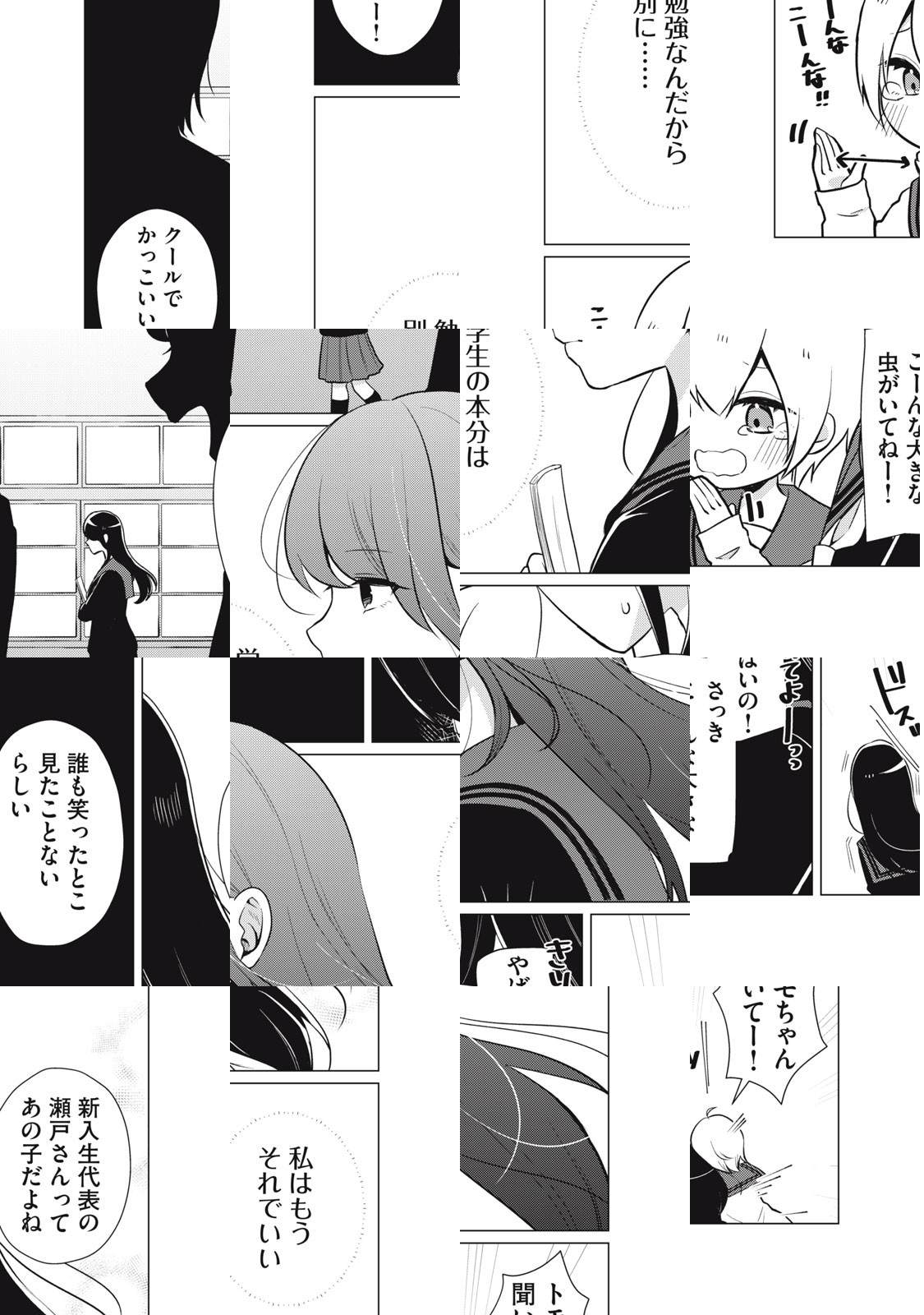キレイでかっこいい学級委員長の瀬戸さん。笑った顔はきっと素敵なはず。……見たい! 入学式のときからちょっと接点があったドジっ子の紬ちゃんが、果敢に瀬戸さんを笑わそうと多彩な作戦を繰り出して失敗するショートコミック。……なのだけど、瀬戸さんの様子がどうもおかしい!!!!