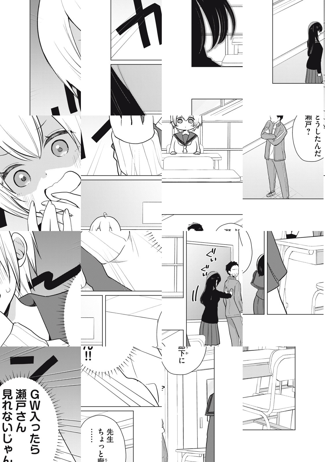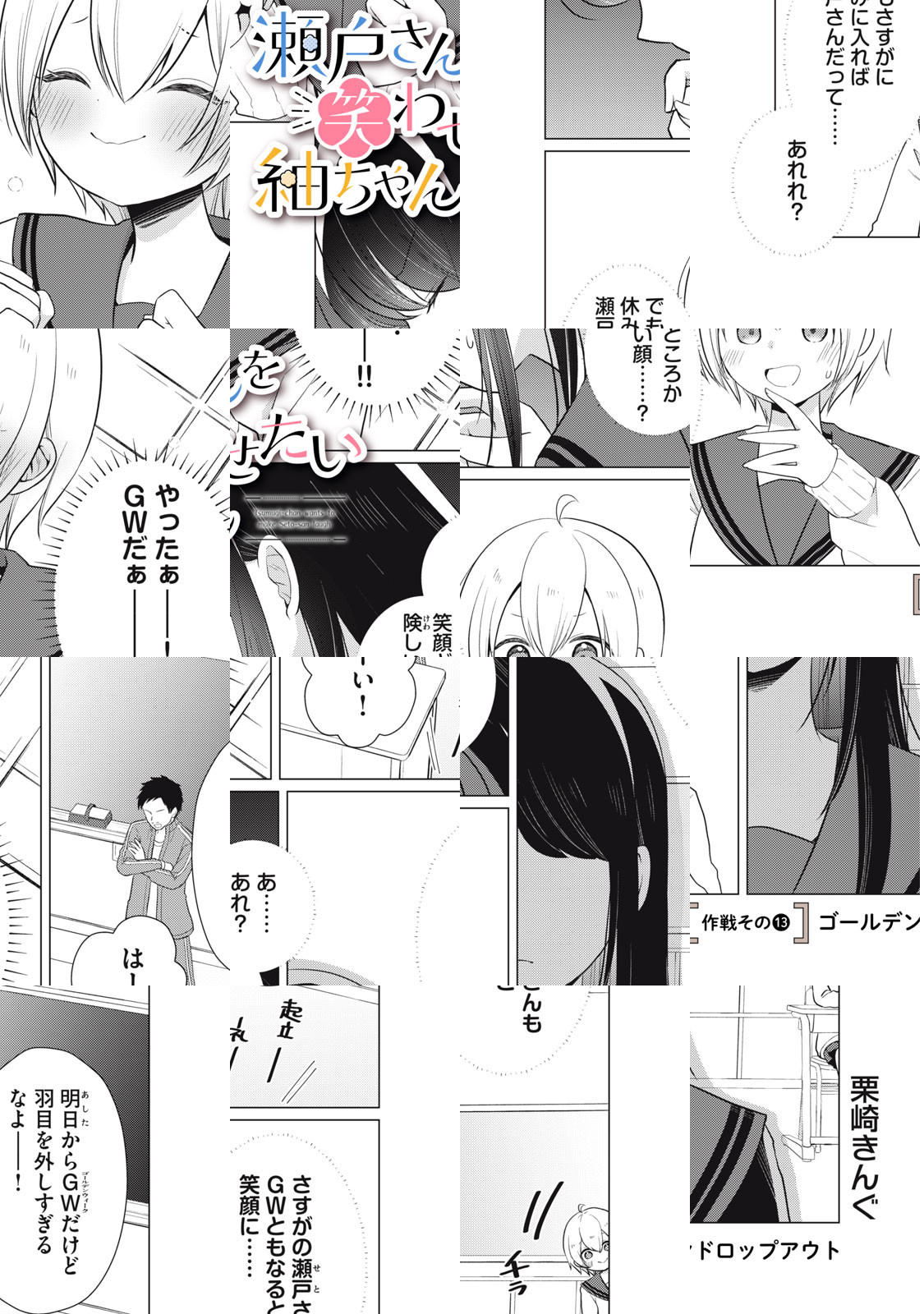 キレイでかっこいい学級委員長の瀬戸さん。笑った顔はきっと素敵なはず。……見たい! 入学式のときからちょっと接点があったドジっ子の紬ちゃんが、果敢に瀬戸さんを笑わそうと多彩な作戦を繰り出して失敗するショートコミック。……なのだけど、瀬戸さんの様子がどうもおかしい!!!!