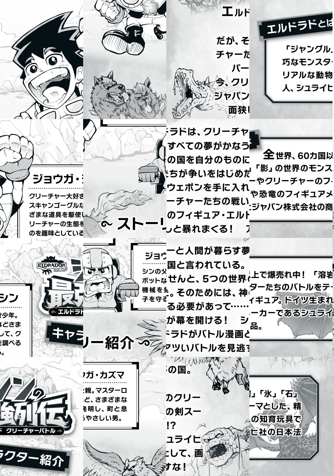 エルドラドは、クリーチャーと人間が暮らす夢の国。すべての夢がかなう国と言われている。だが、その国を自分のものにせんと、4つの世界のクリーチャーたちが争いをはじめた。そのためには、神の剣スーパーウェポンを手に入れる必要があって……!? 今、クリーチャーたちの戦いが幕を開ける!シュライヒジャパンのフィギュア・エルドラドがバトル漫画化!アツいバトルを見逃すな!