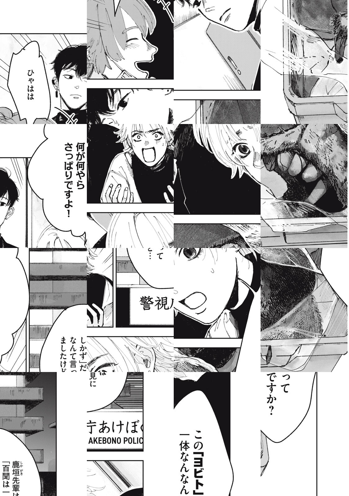 巨大な黒い慰霊碑が建つあけぼの町。かつて落ちてきた隕石によって甚大な被害を受けたこの街は、日本ワースト1の治安の悪さを誇っていた。「あけぼの町刑事課特捜二係」に配属された卯波ハルは、ある事件の捜査に取り掛かることになる。被害者の身体が真っ二つになるという凄惨な事件の現場で、ハルは謎多き生命体「ヨビト」と遭遇し…。美麗な筆致で贈る、本格ダークアクション!