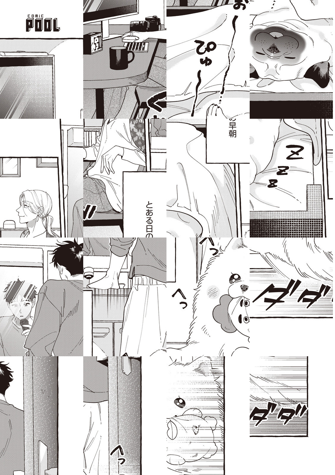 見た目も性格も正反対な男女と2匹の犬が、散歩中に出会うーーー。もふもふ小型犬 × びびりな彼と、こわもて大型犬 × パワーな彼女…画面いっぱいのギャップ萌えにほっこりすること間違いなしっ♪