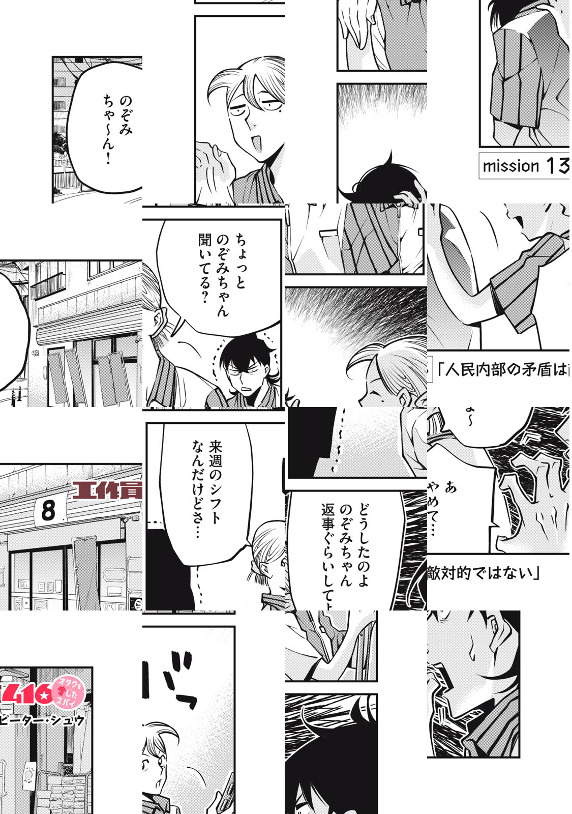 任務で日本へ潜入することになった某社会主義国の工作員416(通称:ヨン・イム)。彼が日本社会に馴染むために選んだのは資本主義の魔窟ともいえるコンビニだった。そこで出会ったのが、引きこもりのため人との距離感がちょっとおかしいオタクの森山のぞみ。スパイとオタク、対人距離感がお互いにバグっている二人の不器用ラブコメ