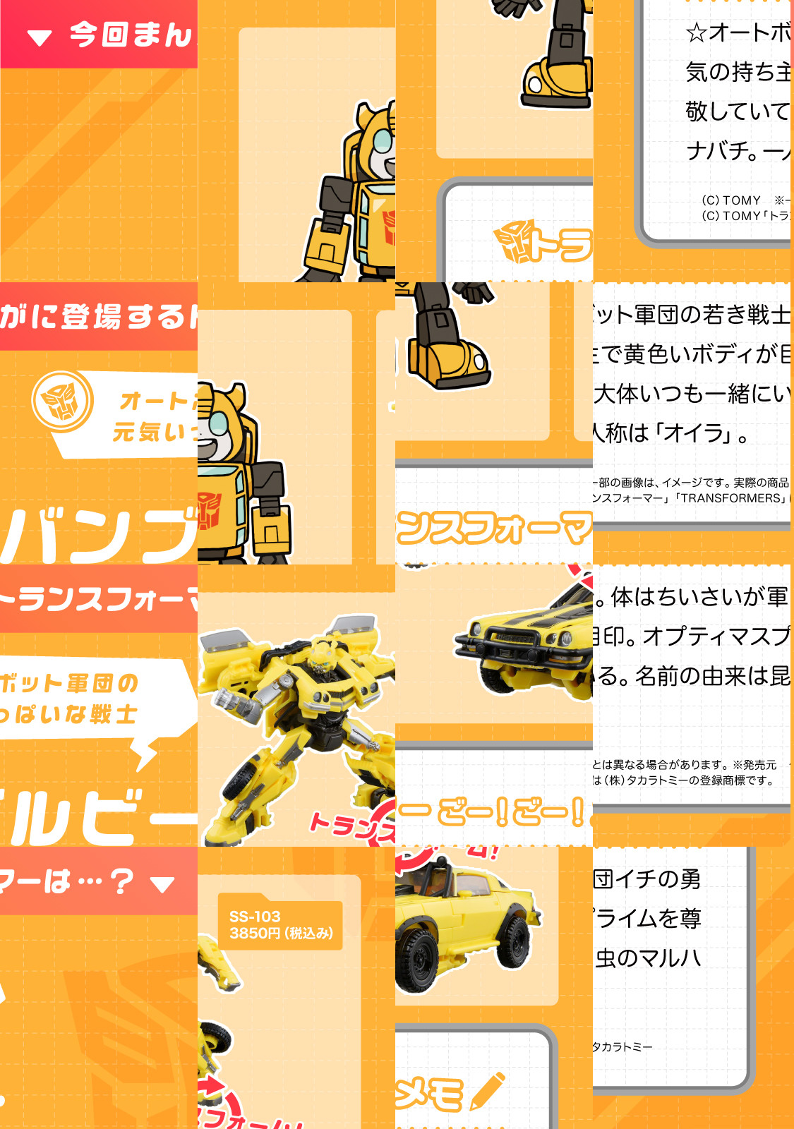 2023年新作映画公開! あのタカラトミー原作の『トランスフォーマー』がキュートな漫画になりました。バンブルビー、オプティマスプライムだけでなく、メガトロン、スタースクリームなど悪役キャラも大活躍! いろいろなものをスキャンして、のりものや動物に変形する超ロボット生命体『トランスフォーマー』の笑って癒やされるギャグ。テレマガネットでも話題沸騰中です!