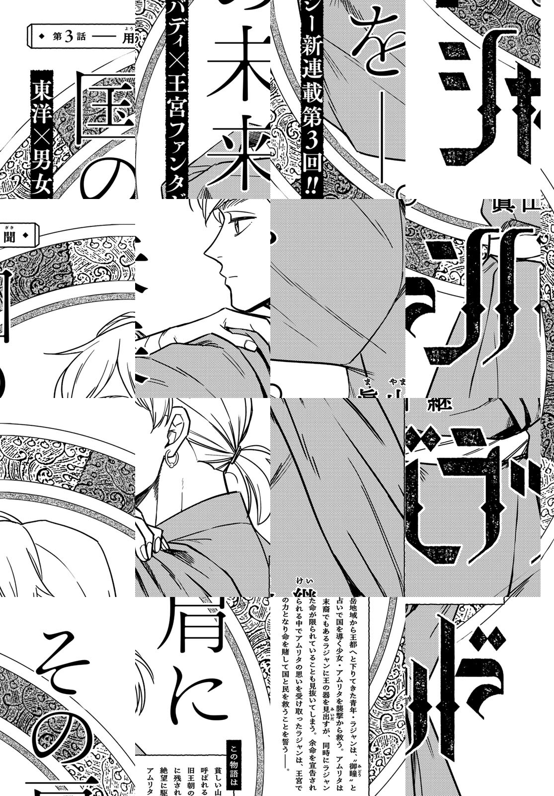 貧しい山岳地域から王都へと下りてきた青年・ラジャンは、“御瞳(みどう)”と呼ばれる占いで国を導く少女・アムリタを襲撃から救う。王宮の悪政に苦しむ民を前になす術を持たないでいたアムリタは旧王朝の末裔でもあるラジャンに王の器を見出すが、同時にラジャンに訪れる不幸な未来も見抜いてしまい──!? 正義感あふれる青年と先見の能力を持つ少女が悪政はびこる王宮に挑む東洋×男女バディ×王宮ファンタジー!