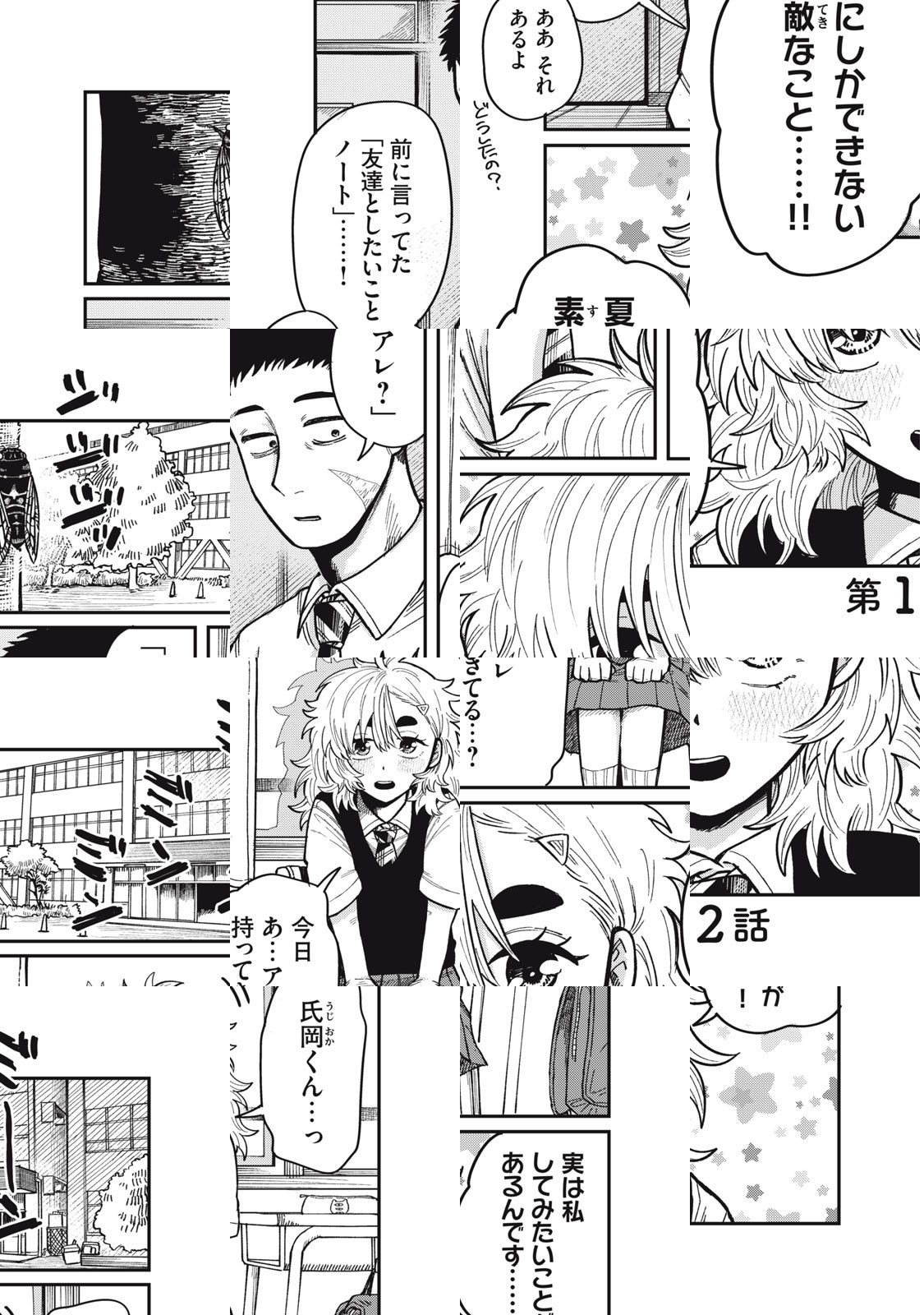 身長192センチ、顔に傷を持ち周りから「怖い人」だと勘違いされる氏岡佐の今までの学生生活は寂しい日々だった。高校入学の日、友達をつくって楽しい高校生活にしようと意気込む氏岡の前に、バナナの皮で転ぶ下星崎小鶴との衝撃的な出会いが待っていた! とんでもなく空回っちゃうけど、氏岡を見た目で判断しない、一生懸命に頑張る下星崎に心を打たれた氏岡は、友達になることに!? 友達も青春も初心者だけど、二人で青春、頑張るぞ!!