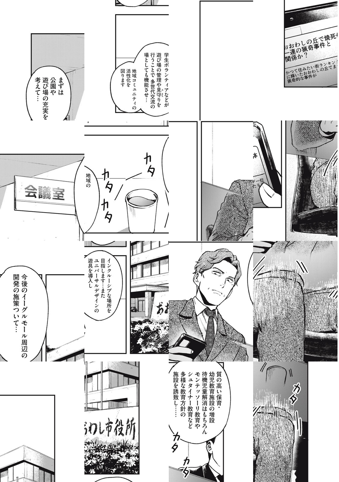 住みたい街ランキングNO.1である「おおわしの丘」。そこで、目、鼻、口、耳が切り落とされた死体と、切り落とされた目、鼻、口が張り付けられた遊具が発見された。事件を調べるのは、異常に「見える」女性・深見。彼女は真相を探るが、新たな事件が起こり…。