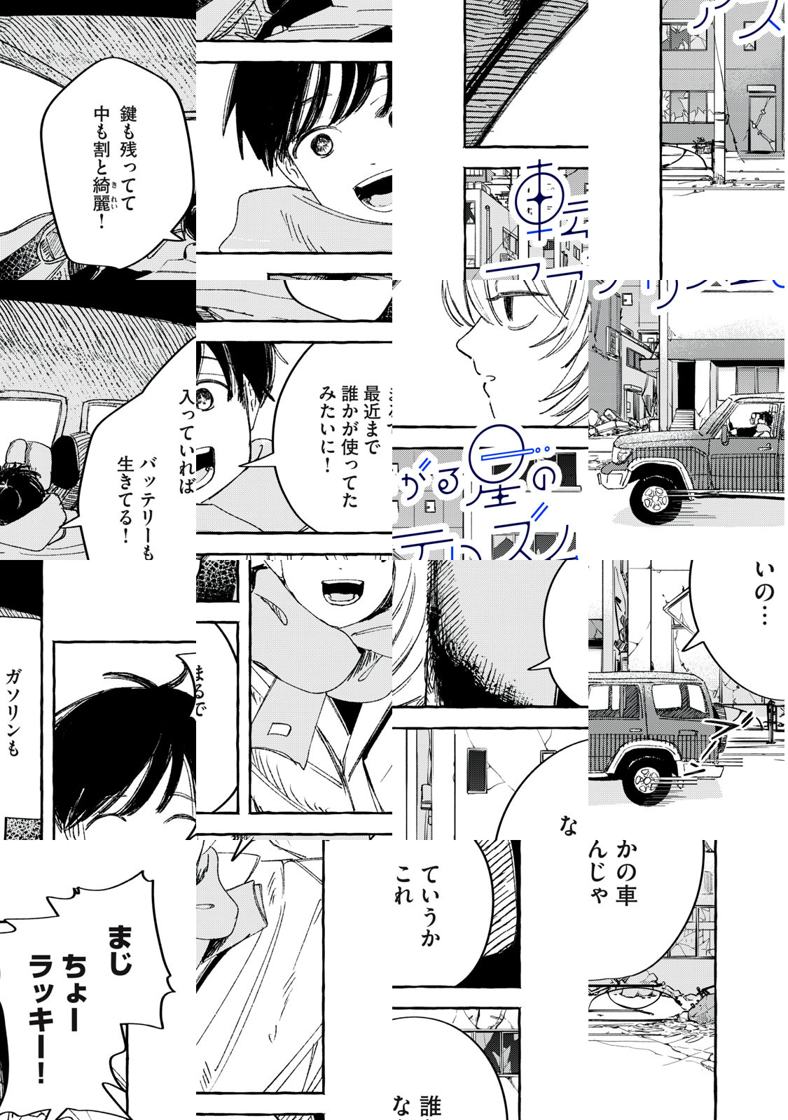 隕石の衝突により滅亡した日本。羽白とサクの二人は、一台の四駆に乗り、南十字星が見える場所を目指して旅に出るが、先々で出会うのはクセ者ばかり…。期待の新人・藻井なにも、鮮烈連載デビュー!