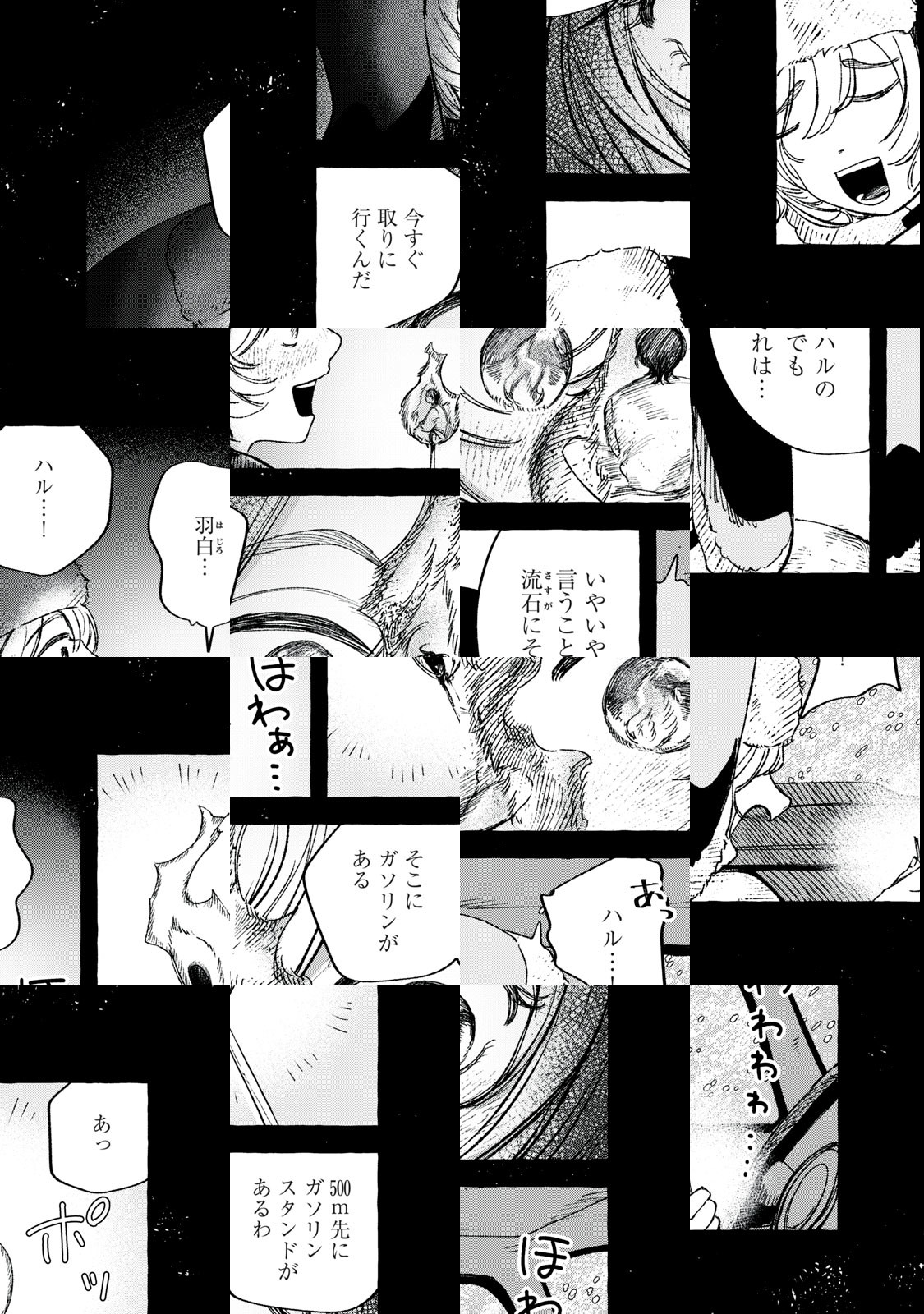 隕石の衝突により滅亡した日本。羽白とサクの二人は、一台の四駆に乗り、南十字星が見える場所を目指して旅に出るが、先々で出会うのはクセ者ばかり…。期待の新人・藻井なにも、鮮烈連載デビュー!