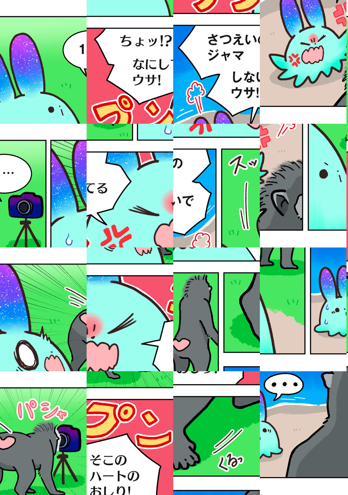 「ウサウサ」は、地球侵略のために月からやってきた(自称)エリートバニバニー人。相手の姿をコピーできる能力を使って、地球の侵略を開始した。しかし、他人のうんちで家を温める鳥に秘密基地を奪われたり、お尻の穴の匂いを嗅ぎあって決闘する動物のバトルに巻き込まれたり、なぜかいつも上手くいかなくて大ピンチに……!