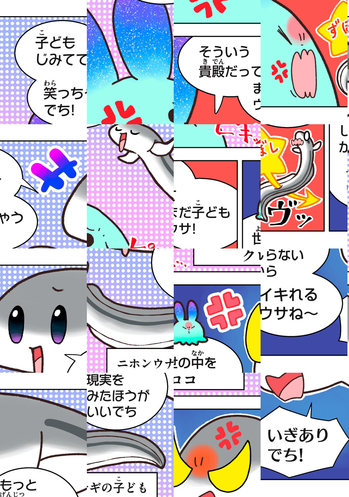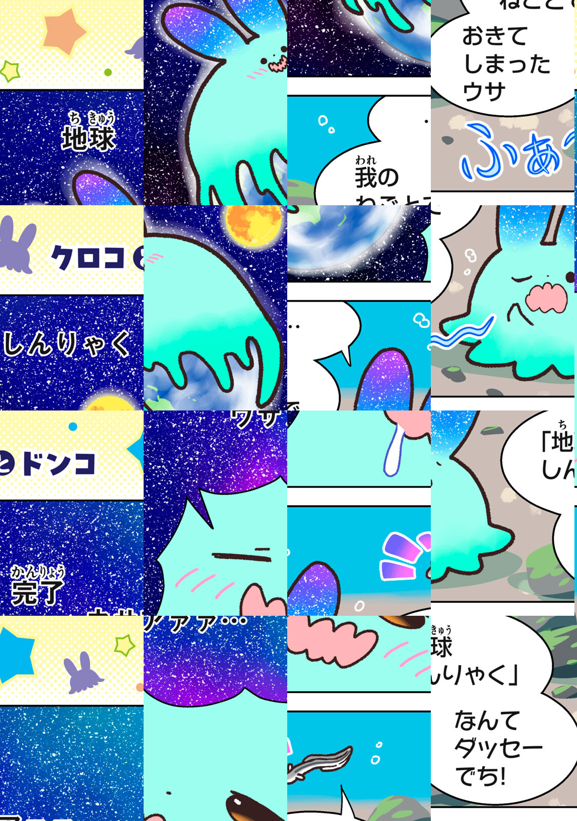 「ウサウサ」は、地球侵略のために月からやってきた(自称)エリートバニバニー人。相手の姿をコピーできる能力を使って、地球の侵略を開始した。しかし、他人のうんちで家を温める鳥に秘密基地を奪われたり、お尻の穴の匂いを嗅ぎあって決闘する動物のバトルに巻き込まれたり、なぜかいつも上手くいかなくて大ピンチに……!