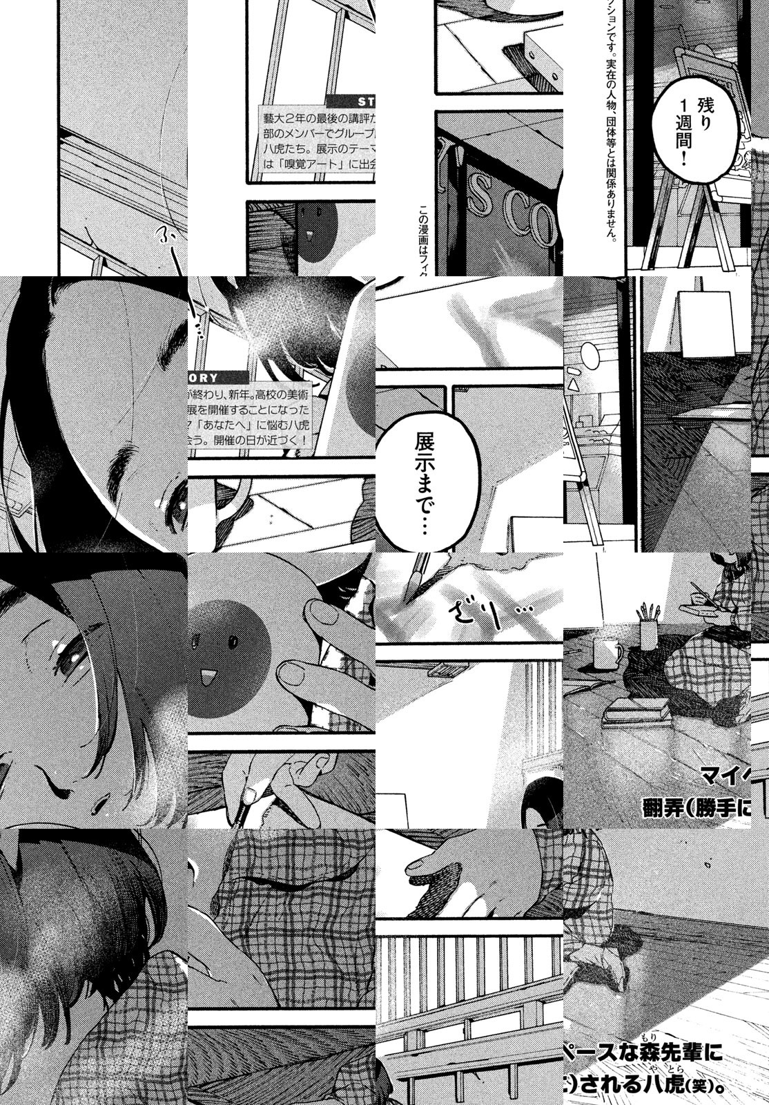 成績優秀かつスクールカースト上位の充実した毎日を送りつつ、どこか空虚な焦燥感を感じて生きる高校生・矢口八虎(やぐち やとら)は、ある日、一枚の絵に心奪われる。その衝撃は八虎を駆り立て、美しくも厳しい美術の世界へ身を投じさせていく。美術のノウハウうんちく満載、美大を目指して青春を燃やすスポ根受験物語、八虎と仲間たちは「好きなこと」を支えに未来を目指す!