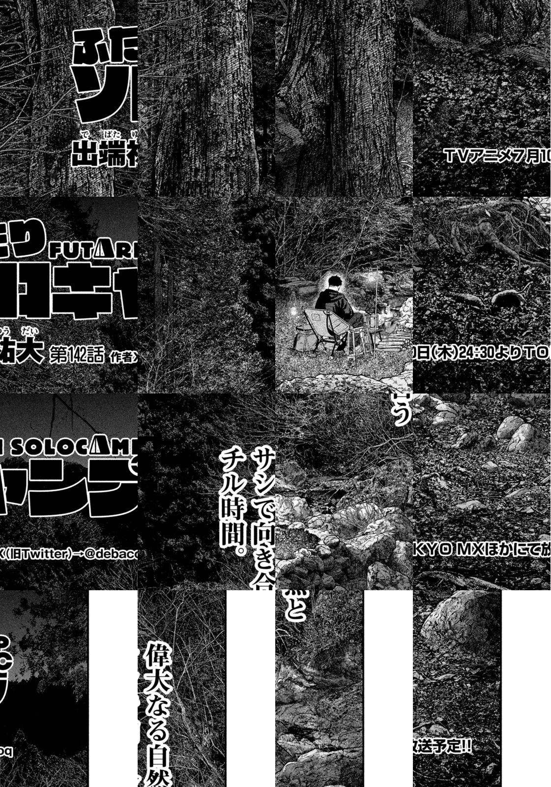 オレは樹乃倉厳。34歳。趣味はキャンプ。独りで野営する生粋のソロキャンパー。車はいらない。電車を乗り継ぎ、最後はバスで山に入る。自然を愛してる、火を木を水を土を。それと同等に孤独な自分の生き方を愛している―ーー。…な俺が! ひょんなことから草野雫20歳という小娘に出会い、ふたりでソロキャンプをするはめに!
