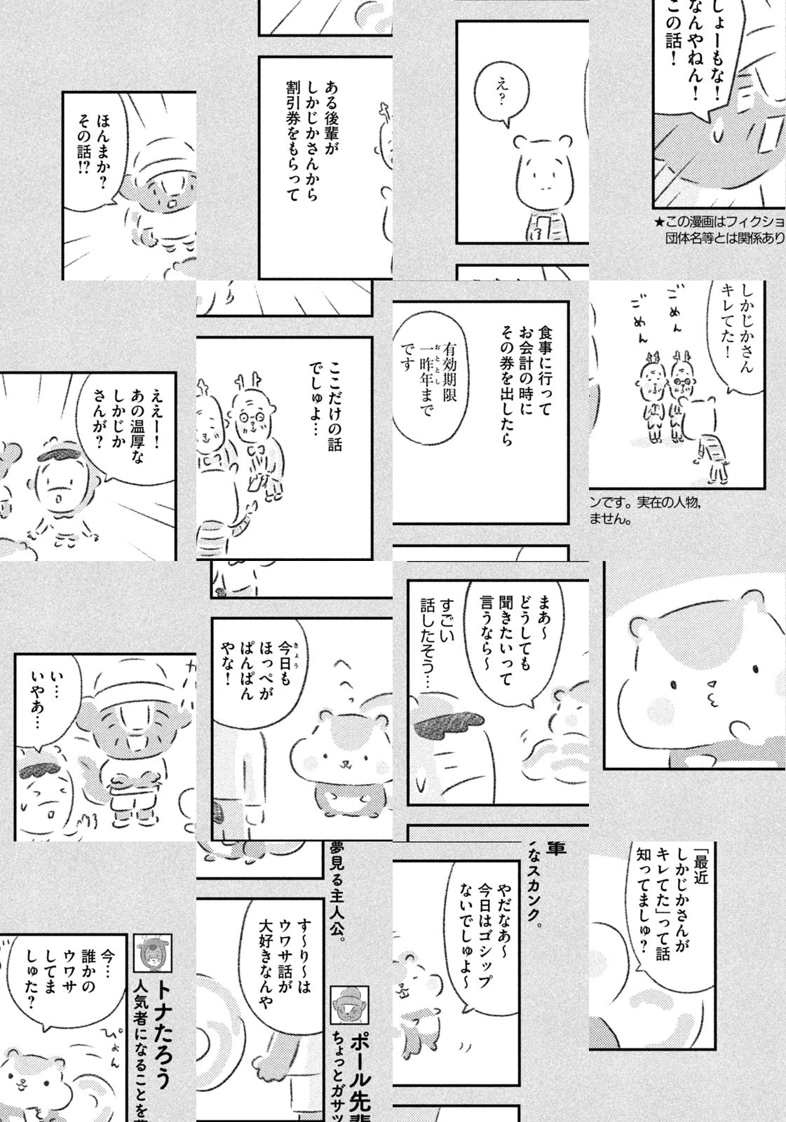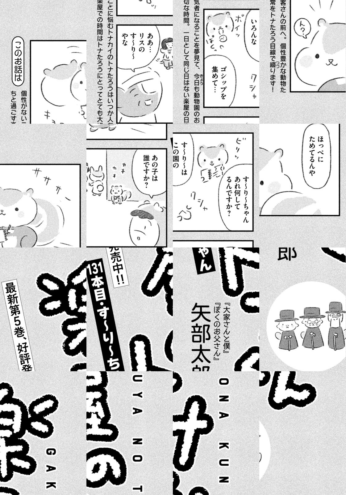 先輩にはいびられ、後輩には舐められ、お客さんには気づかれない主人公・トナカイのトナたろう、ちょっとガサツでデリカシーのないスカンクのポール先輩、元気すぎるお猿のアーコ、大人気のパンダくんなど、どこか見たことあるような動物たちの楽屋での悲喜こもごもなアニマル賛歌。自分の才能や“動物関係”に今日も悩みながら切磋琢磨する動物たちの舞台裏を覗いてみませんか?