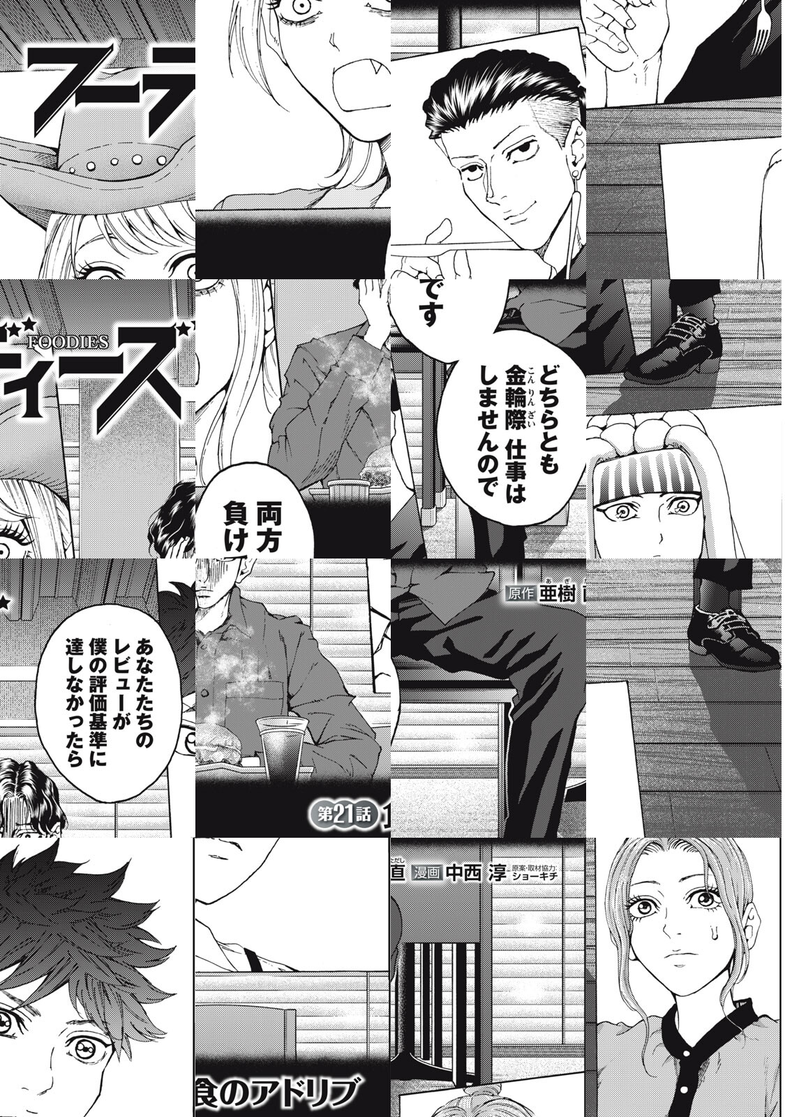 伝説の料理人の孫・頂拓味が会社から命じられたのは、新規グルメレビューサイトの立ち上げ。真のフーディーから希少な「食レポ」をもらいたいが、その頃フード大手・天食も同事業をスタートさせて――。超個性的な美食家たちを自陣に引き入れるため、両社フーディーハンターによる熾烈な綱引きが始まった! あの行列必至の有名店が続々実名協力、大ベストセラー『神の雫』の亜樹直原作で贈る、因縁の食レポバトル!