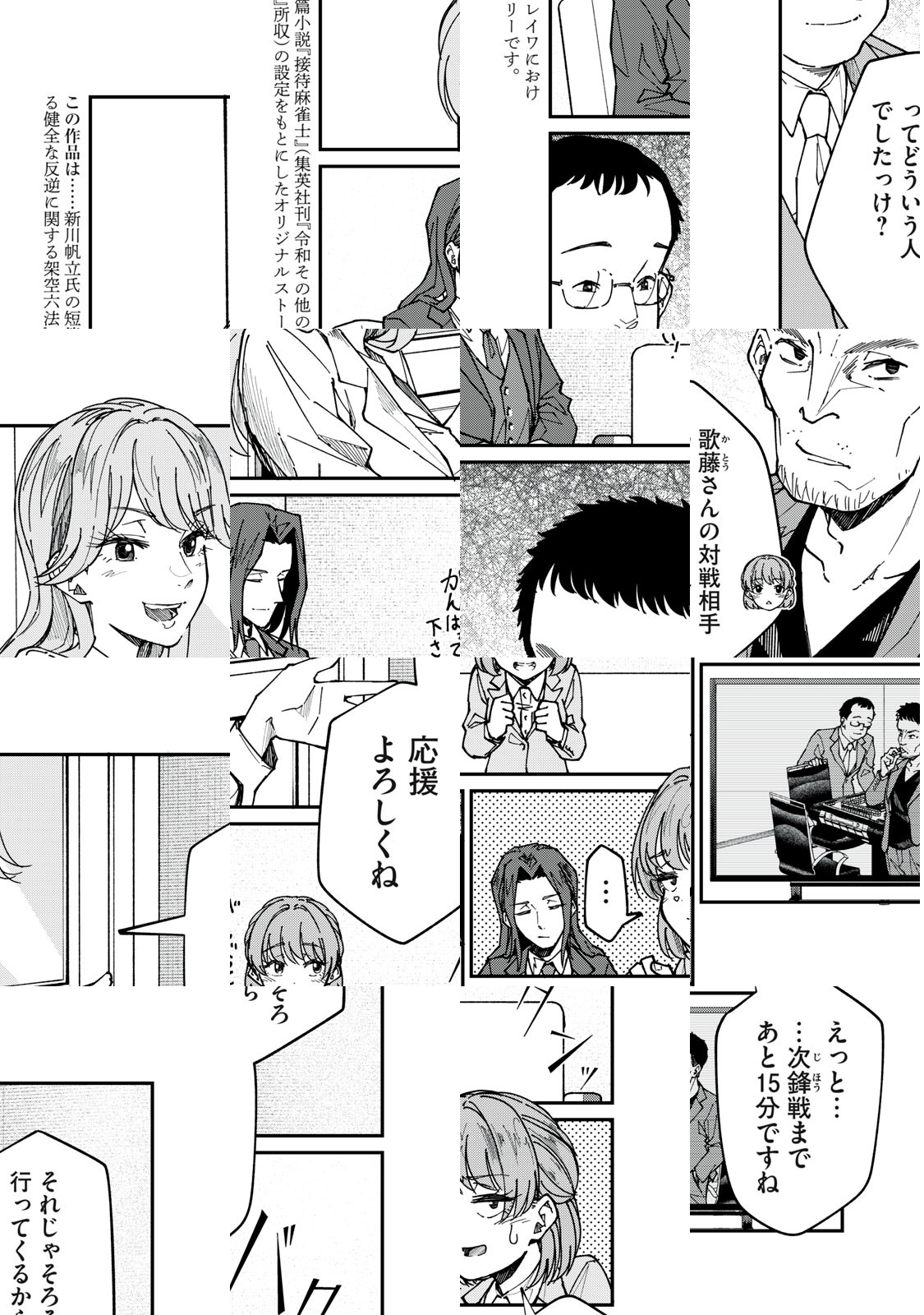 風祭建設に入社した新入社員・スズメが、配属されたのは、「接待麻雀課」!? 「賭け麻雀は認知症予防になる」との研究報告を元に、賭け麻雀が合法化された世界で、企業戦士たちが社運を懸け、麻雀バトルを繰り広げていた!小説家・新川帆立氏の『令和その他のレイワにおける健全な反逆に関する架空六法(集英社刊)』収録の『接待麻雀士』から生まれた近未来ビジネスサスペンス開幕!