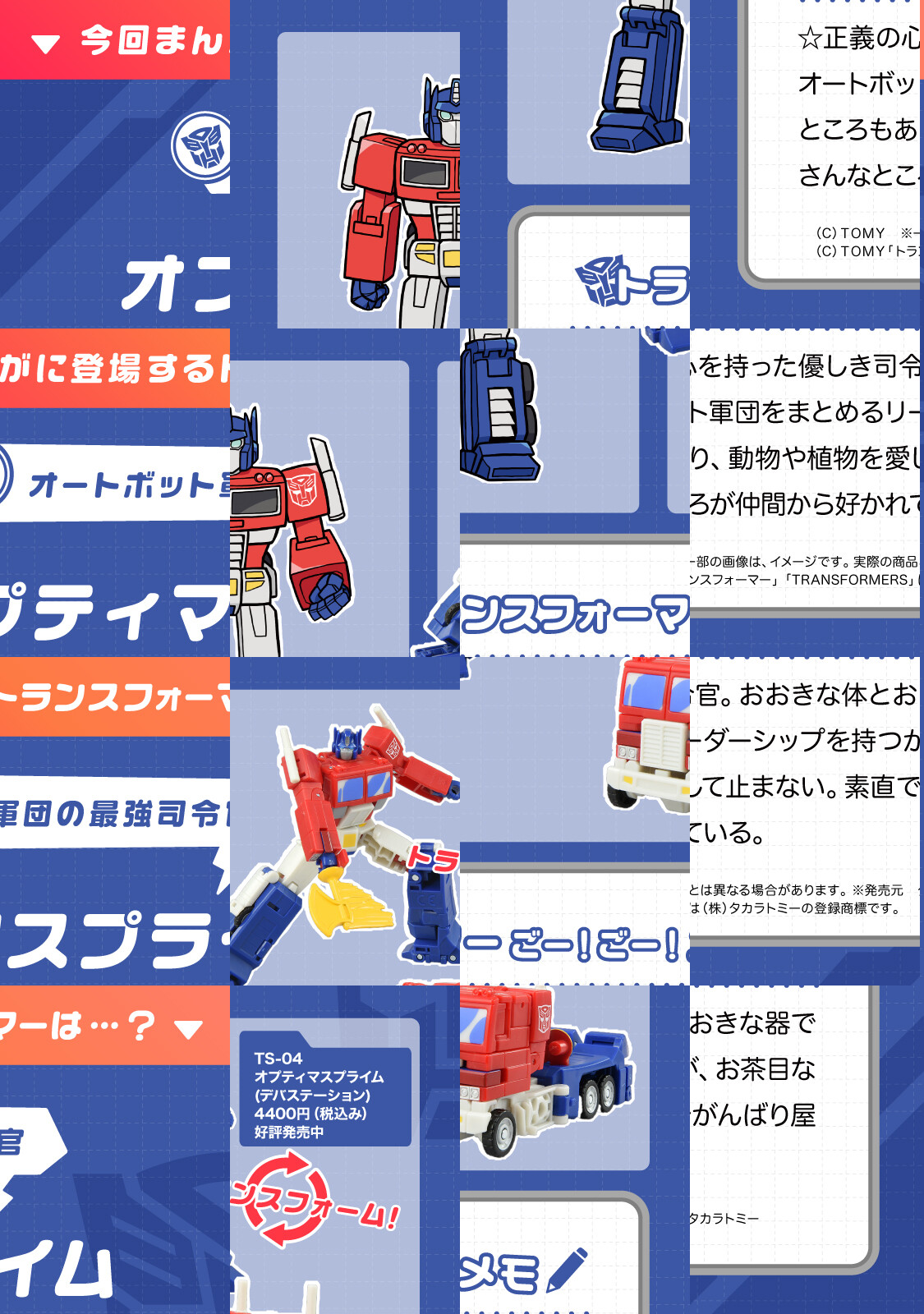 2023年新作映画公開! あのタカラトミー原作の『トランスフォーマー』がキュートな漫画になりました。バンブルビー、オプティマスプライムだけでなく、メガトロン、スタースクリームなど悪役キャラも大活躍! いろいろなものをスキャンして、のりものや動物に変形する超ロボット生命体『トランスフォーマー』の笑って癒やされるギャグ。テレマガネットでも話題沸騰中です!