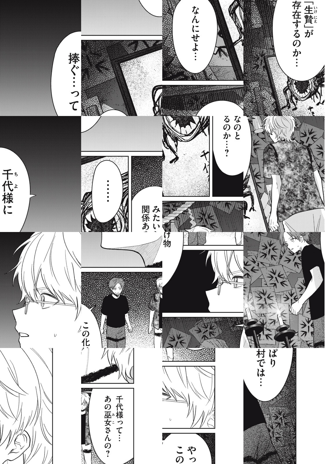 「ねぇ颯太、アレを見たんでしょう」――大学生の颯太は、友人のフィールドワークの付き添いで人里離れた村のお祭りに行くことに。そこで出会ったのは、外から来た颯太たちを暖かく歓迎する村の人々、そして”神通力”があるという一人の巫女だった。親切なのにどこか違和感がある村人たち。颯太を何かから「守る」と語る巫女。この村は、何かがおかしい――。二人をつなぐ因縁、それは呪いか運命か。謎がうずまく恋と怪奇の物語。