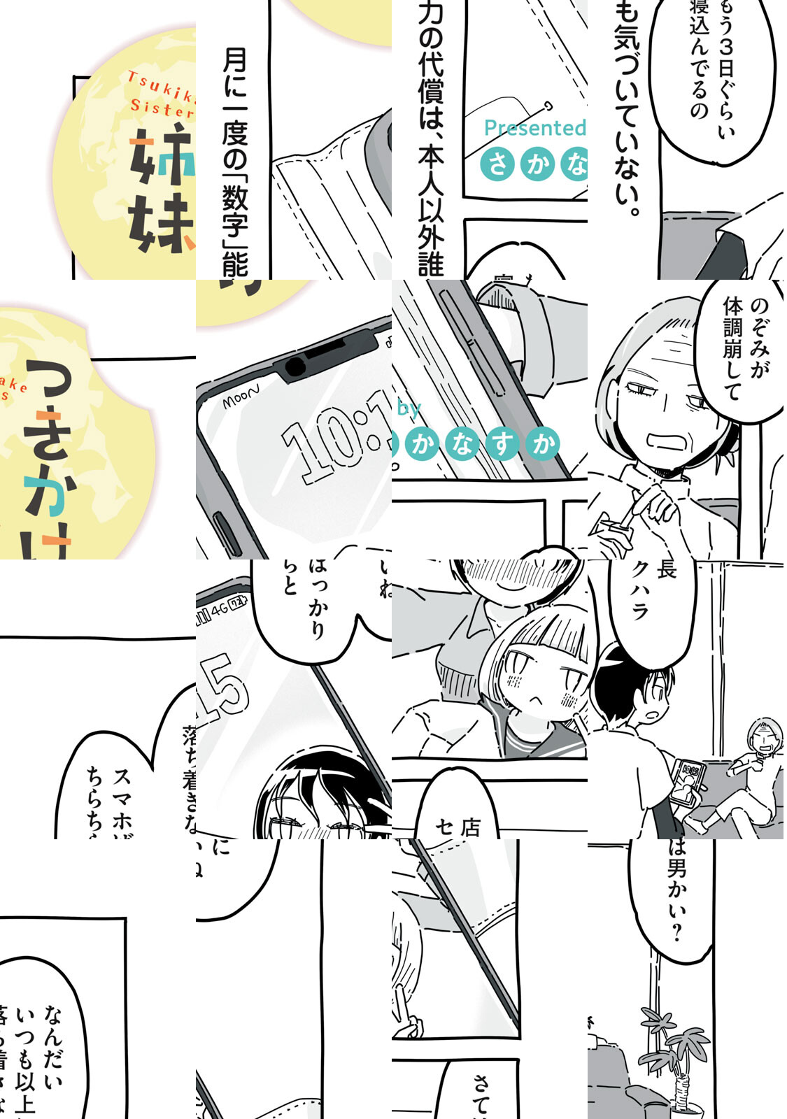 ハイスペックなのにことごとく「外す」残念美女の姉、あきら(21)。そんな姉の力になりたいクールな妹、のぞみ(15)。父親の残した借金で底辺生活を送っている姉妹だが、満月の日はのぞみの能力で「遊ぶ」ことを決めている。その能力とは「何かに『当たる』数字が思い浮かぶ」もの。この数字で一攫千金……は外してしまうけれど、それでも誰かは幸福になる。かくして町内を少しずつ幸福で満たし、いずれは月まで届く……かもしれない、ツキかけ姉妹の愛しき日々!