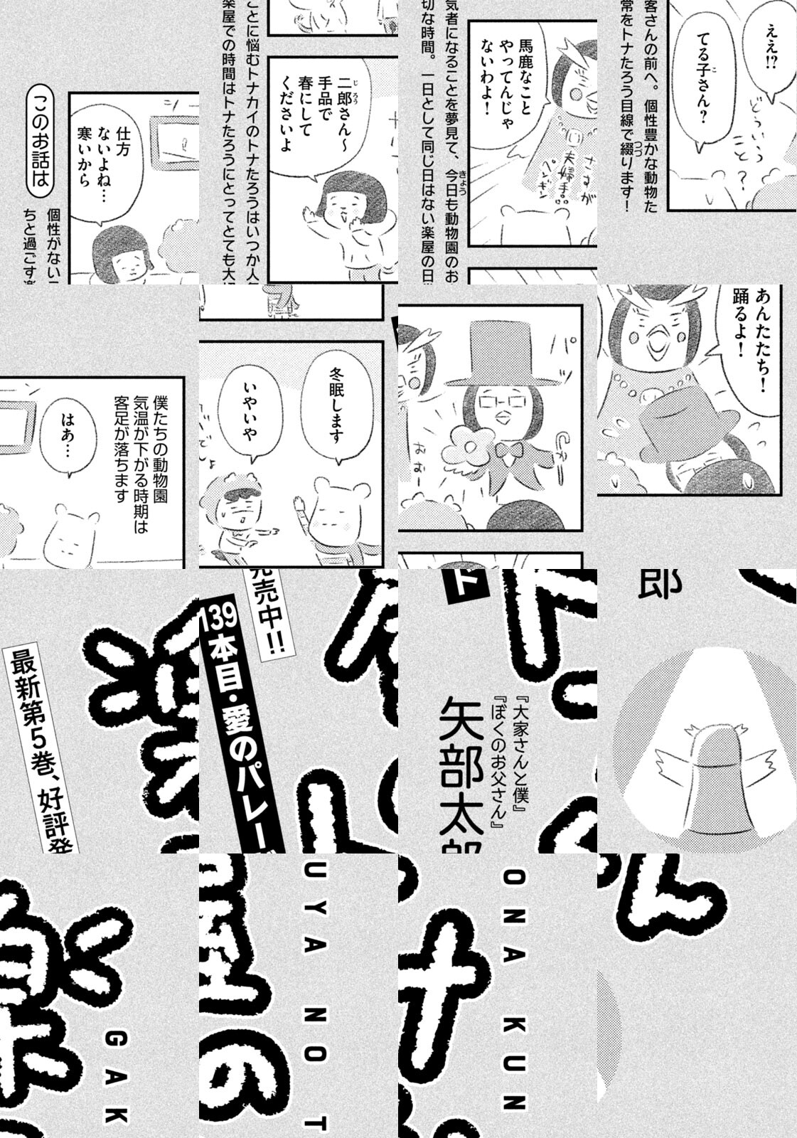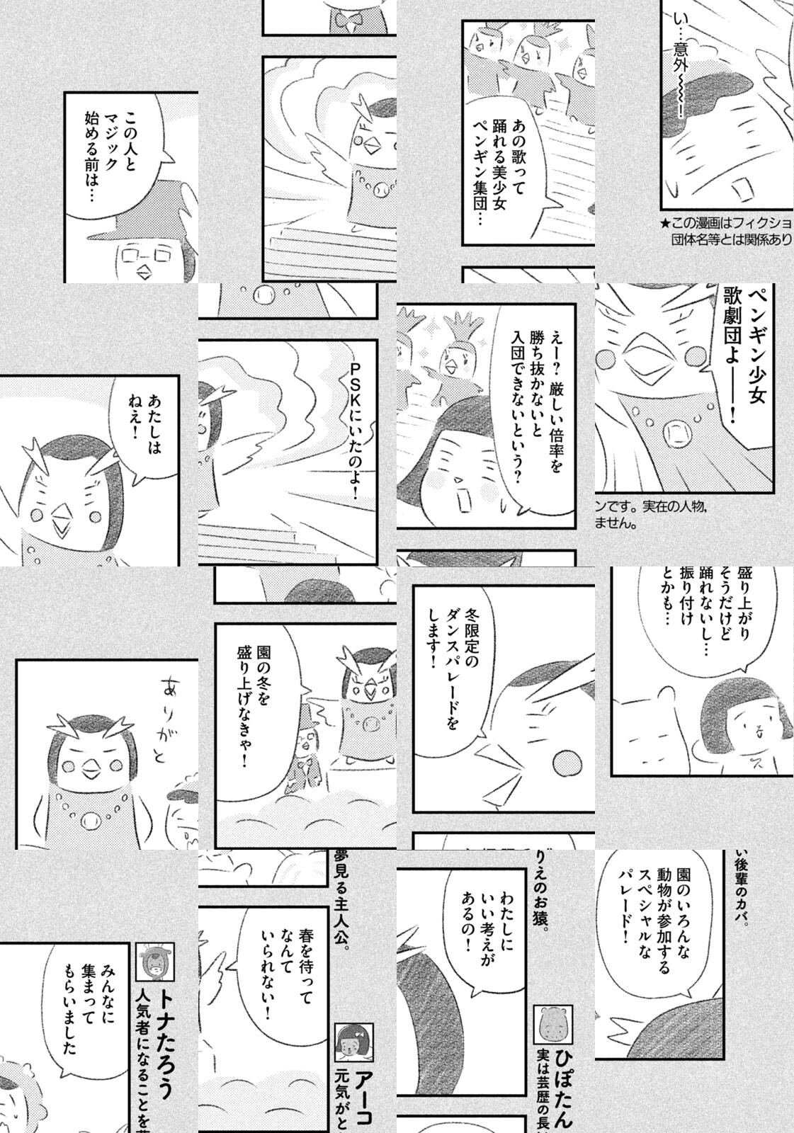先輩にはいびられ、後輩には舐められ、お客さんには気づかれない主人公・トナカイのトナたろう、ちょっとガサツでデリカシーのないスカンクのポール先輩、元気すぎるお猿のアーコ、大人気のパンダくんなど、どこか見たことあるような動物たちの楽屋での悲喜こもごもなアニマル賛歌。自分の才能や“動物関係”に今日も悩みながら切磋琢磨する動物たちの舞台裏を覗いてみませんか?