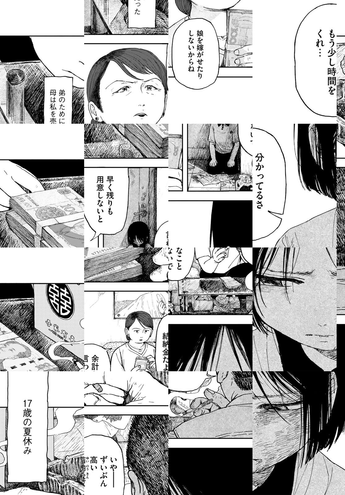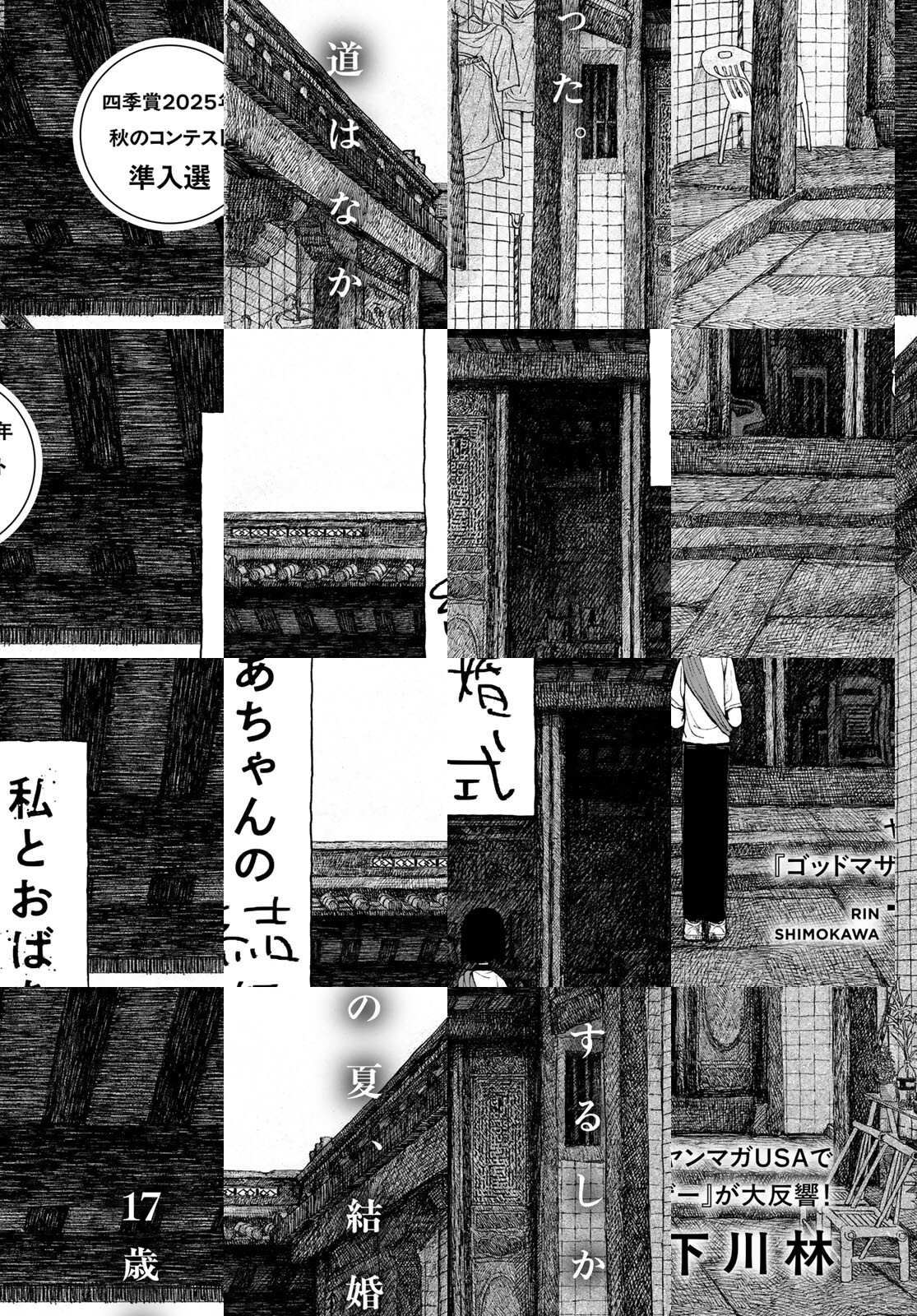【アフタヌーン四季賞2025秋 準入選】弟の進学資金のために、身売り同然の結婚をさせられることになった17歳の小夏(シャオシャ)。息子だけを溺愛している母親は、進学祝賀会を開くため、小夏達を連れて帰省する。叔父夫婦に殺伐とした空気で出迎えられるが、認知症の祖母が小夏のことを、出奔した祖父だと思い込んでしまったことをきっかけに、事態は思わぬ方向へと転がっていく…。
