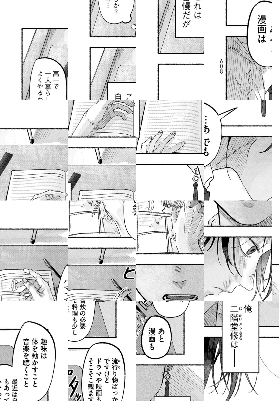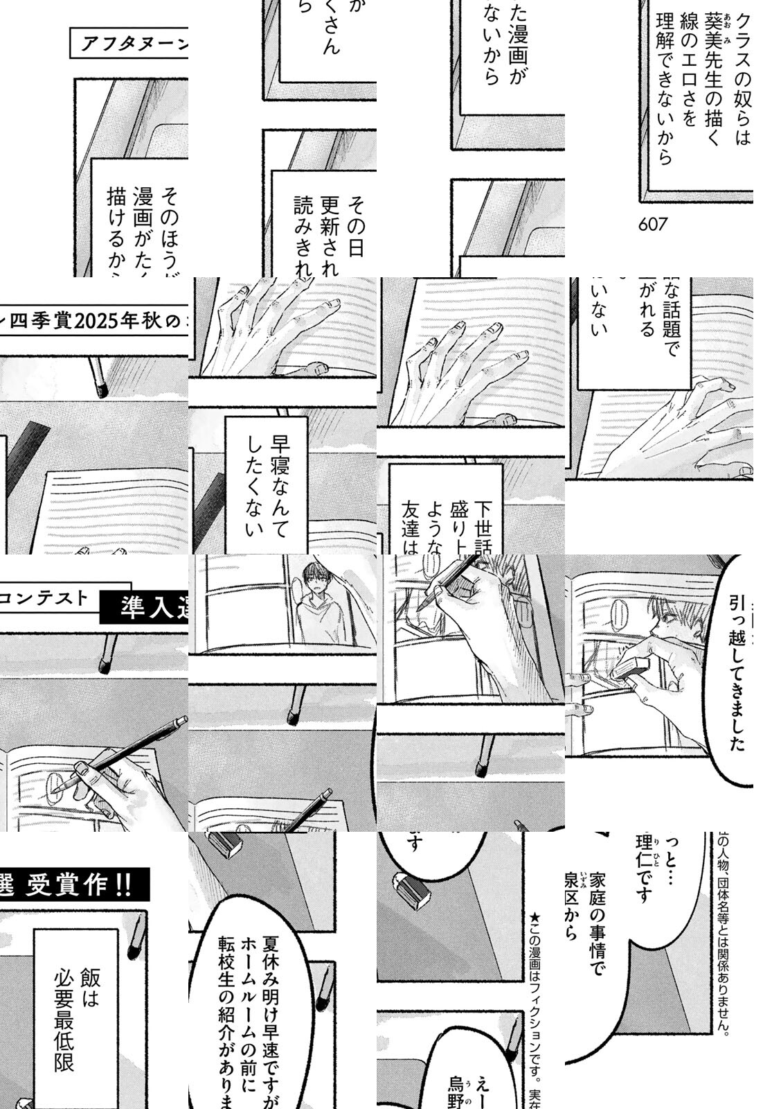 【アフタヌーン四季賞2025秋 準入選】修は、漫画家を目指す高校生。そんな彼の前に、同じように漫画を描く転校生の理人が現れる。二人は漫画を通して仲良くなっていく。しかし、すべてを投げうって漫画を描く修とは違い、理人は他のことにも興味を示して……。