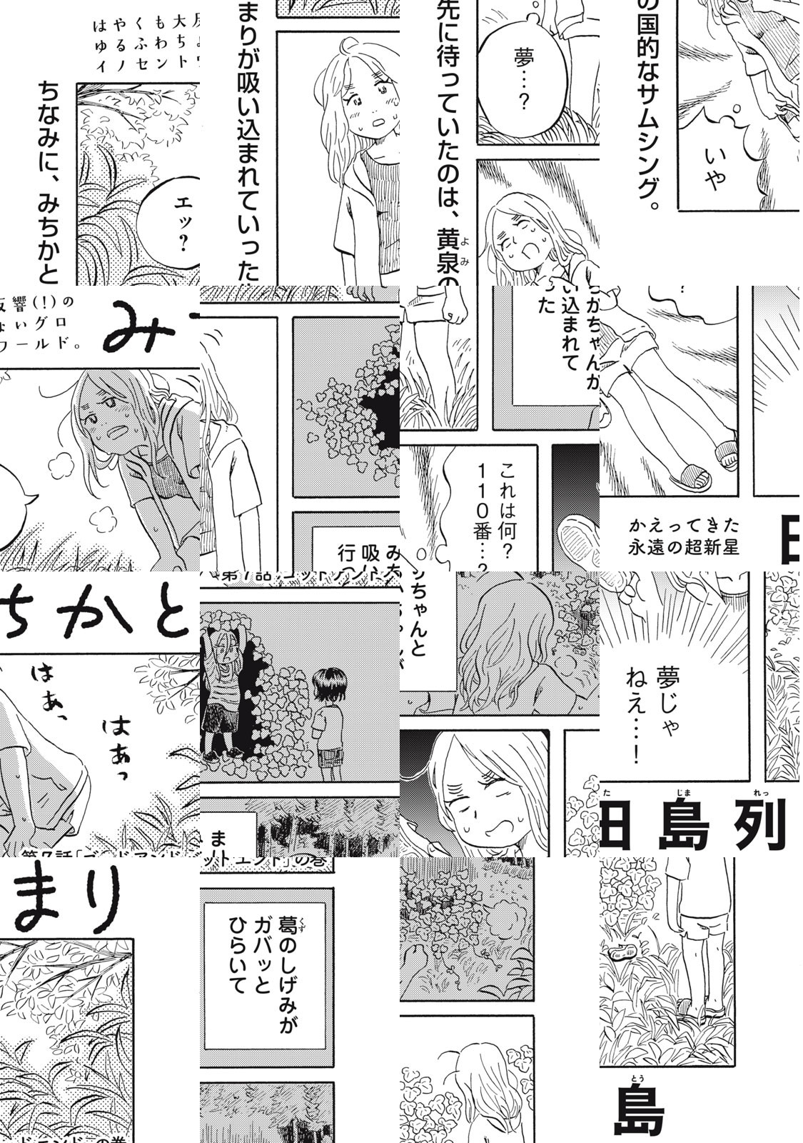 「竹やぶに生えてた子供を、神様にするか人間にするか決めるのは、最初にみつけた人間なんだよ」 8歳の女の子まりはある日、竹やぶでみちかと出会う。みちかが次々と起こす不思議な出来事のおかげで、まりの世界はこれまでと一変してしまうのだった。『子供はわかってあげない』『水は海に向かって流れる』の異才・田島列島が贈る、ゆるふわちょいグロ神話風味ガールミーツガールが開幕。