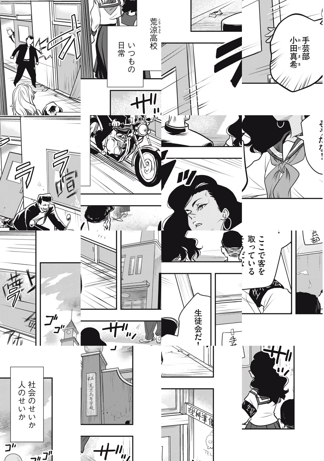 アフロにロンスカといういでたちの女子高生・真希は、風紀の乱れた荒涼高校の1年生。彼女の特技は「刺繍」。真希が刺繍をした学ランを着ると、ケンカに勝てるという噂があるくらい、その腕前はプロ級だった。そんな真希の願いは、この高校に似つかわしくない「手芸部」を立ち上げること。敵やライバルも多く、部活成立へのハードルは高そうだけど⁉